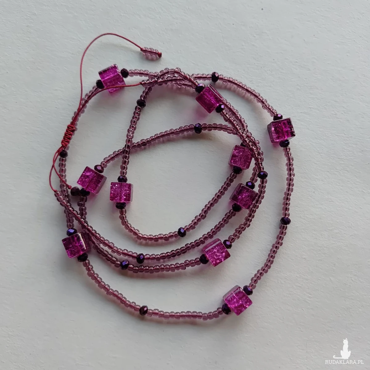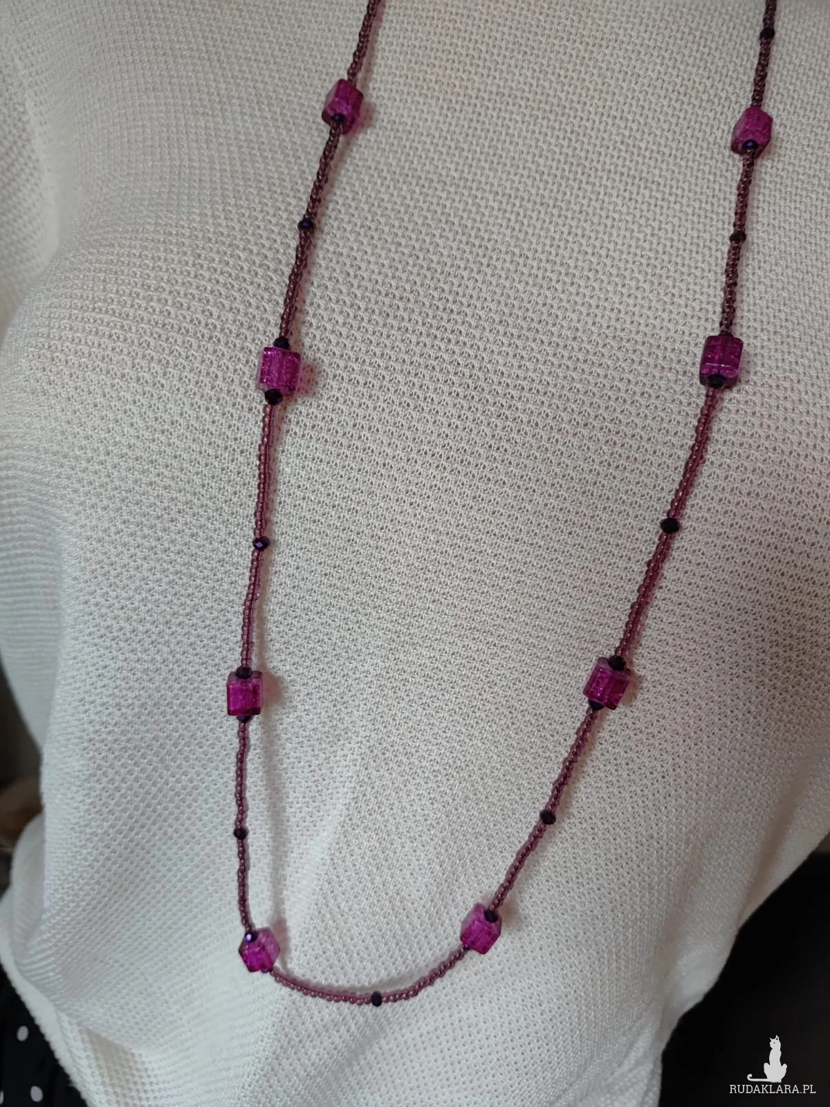 Długi sznur koralików w kolorze fioletowym w połączeniu z kostkami szkła weneckiego 8 mm, sznur korali na sznurku syntetycznym, dlugość sznura 47 cm, bez zapięcia co ułatwia zakładanie korali starszej osobie.