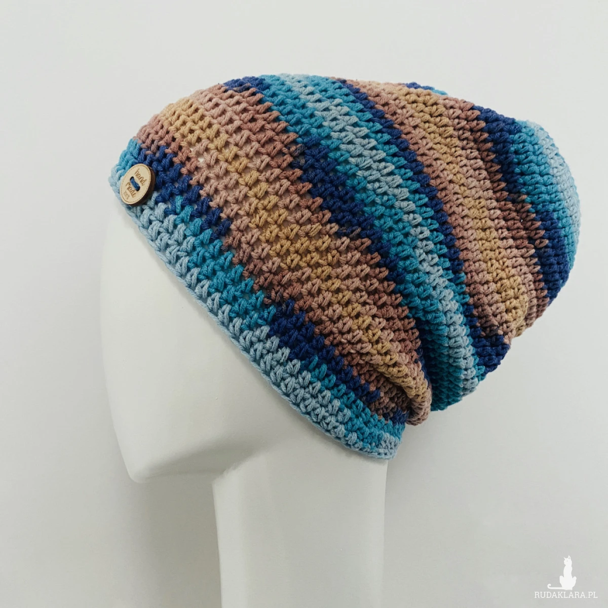 Czapkę wykonałam z wysokiej jakości włóczki bawełniano-akrylowej, która zapewnia wygodę noszenia przez cały dzień.