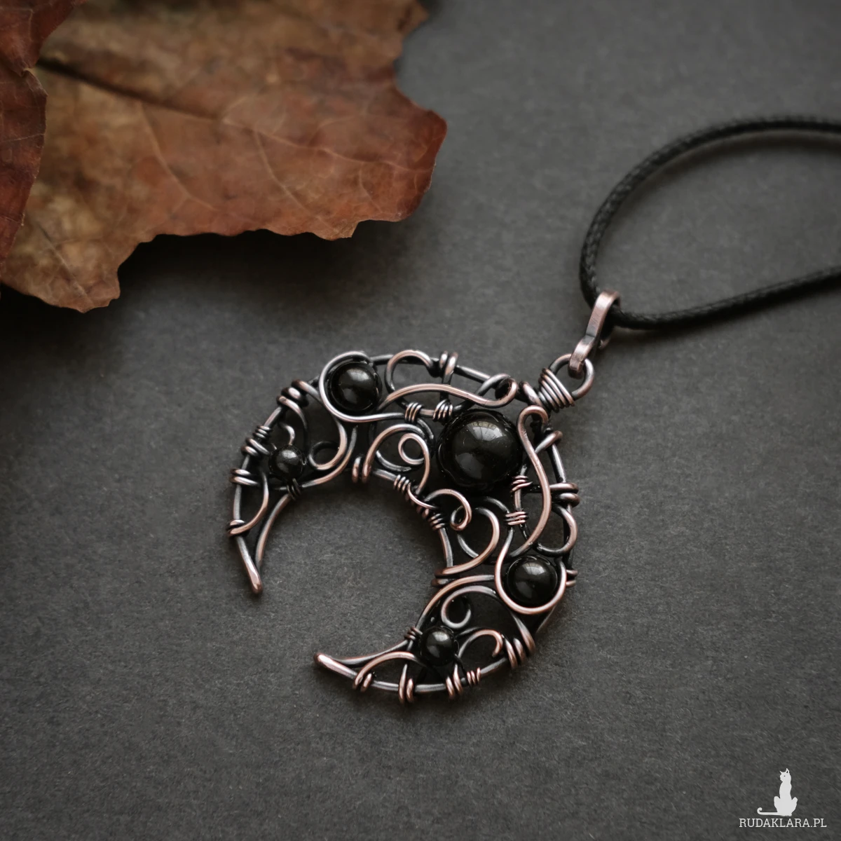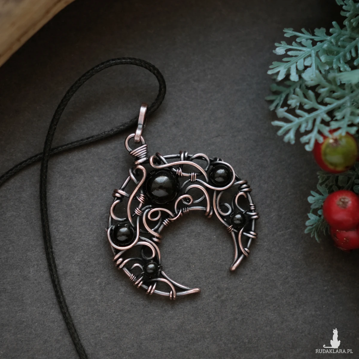 Miedziany wisior - księżyc z kamieniami czarnego turmalinu. Piękne fantazyjne sploty dodają mu baśniowego charakteru.