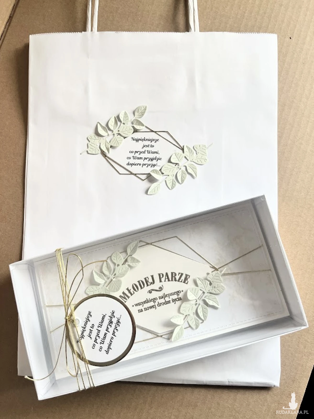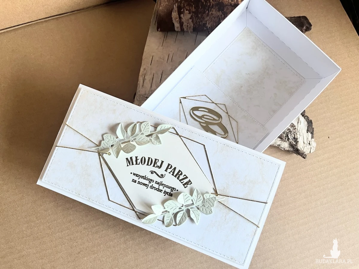 Elegancka, bogato zdobiona kartka w pudełku z okazji ślubu. Utrzymana w delikatnej kolorystyce bieli i złota .ozdobiona delikatnymi liśćmi eukaliptusa.. Kartka jest w całości wykonana ręcznie z najlepszej jakości materiałów do scrapbookingu. Wielkość pudełka z okienkiem 22x11x3,5 Wielkość kartki 21×10 z gotowymi życzeniami do własnoręcznego podpisu.Na dnie pudełka umieszczono kieszonkę na małe co nieco.Do kompletu dodano białą torebkę która jest ozdobiona w tej samej stylizacji co kartka. Wielkość torebki 31x24x10cm.W tej postaci komplet dostępny od ręki.