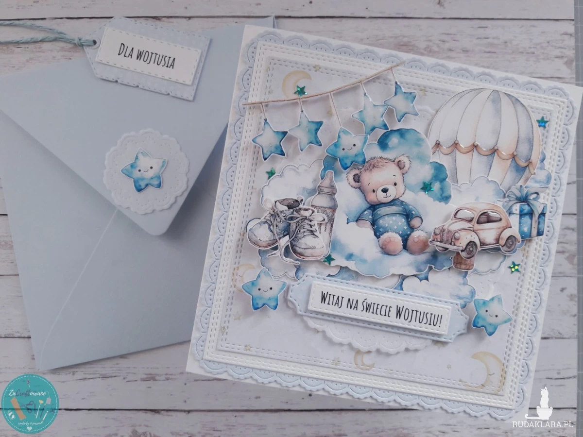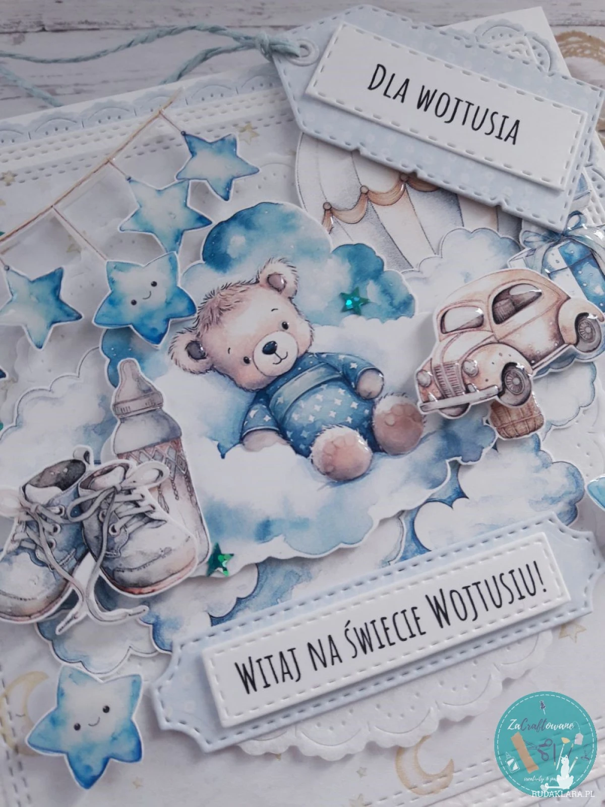 Kartka z okazji narodzin chłopczyka, której motywem przewodnim jest uroczy misiu leżący na chmurce w otoczeniu wesołych gwiazdek, zabawek i innych elementów.