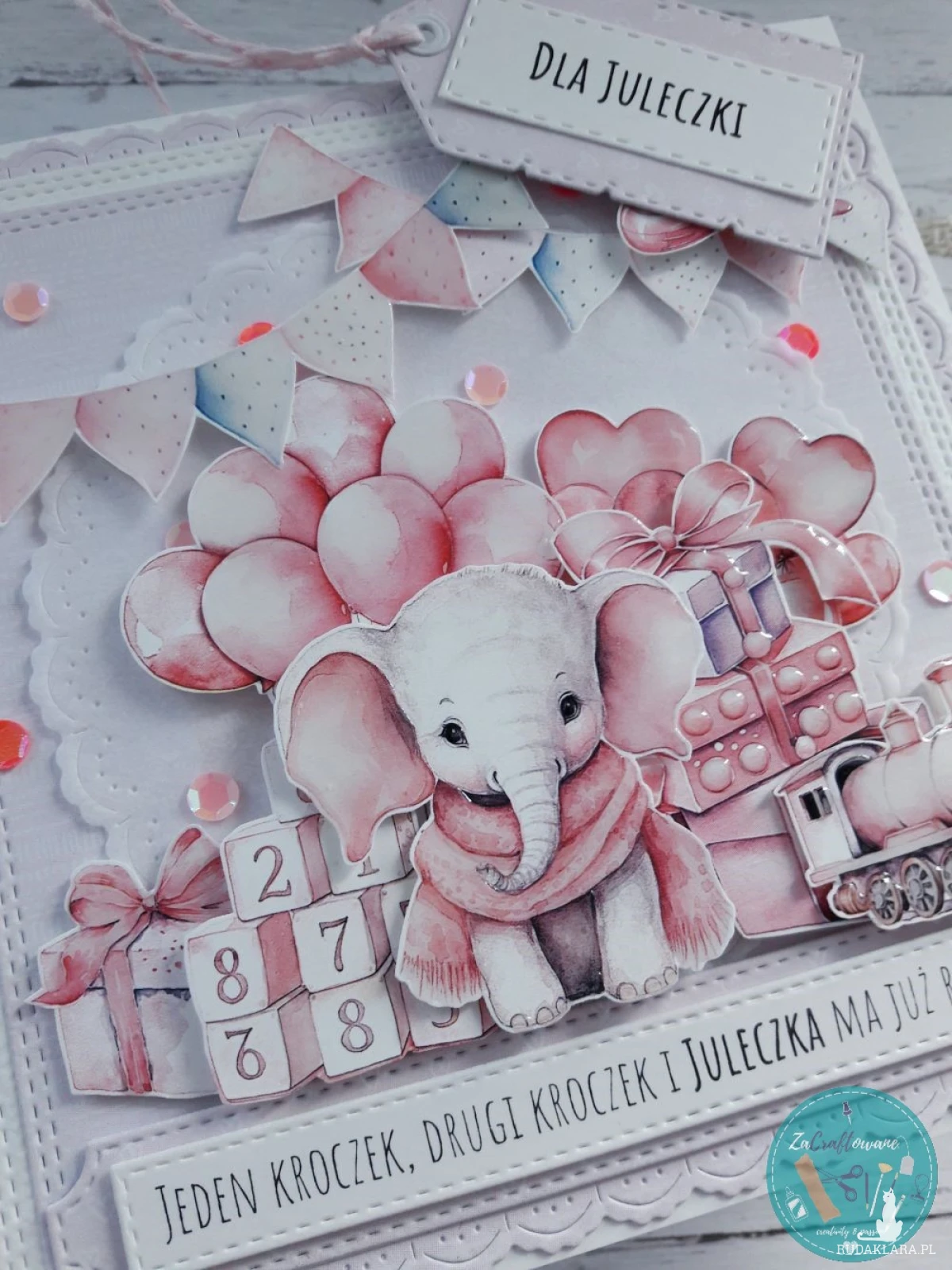 PERSONALIZACJA jest wliczona w cenę kartki. W jej zakres wchodzi umieszczenie dowolnego napisu na banerku z przodu np. „Jeden kroczek, drugi kroczek i [Juleczka] ma już roczek!” oraz umieszczenie życzeń wraz z podpisem i datą wewnątrz kartki.