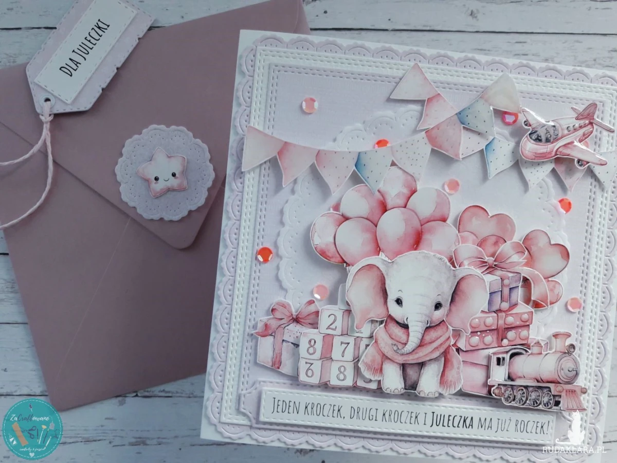 Kartka z okazji 1. urodzin dziewczynki, której motywem przewodnim jest uroczy słonik w otoczeniu balonów i zabawek.
