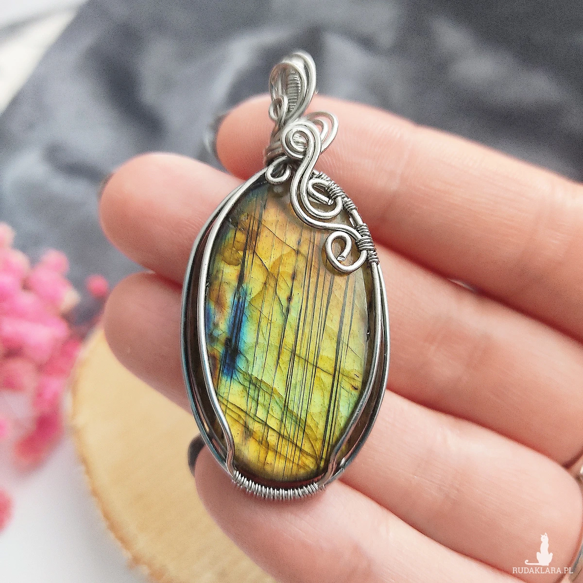 Naszyjnik Labradoryt ręcznie robiony. Wykonany techniką wire wrapping z drutów ze stali chirurgicznej.