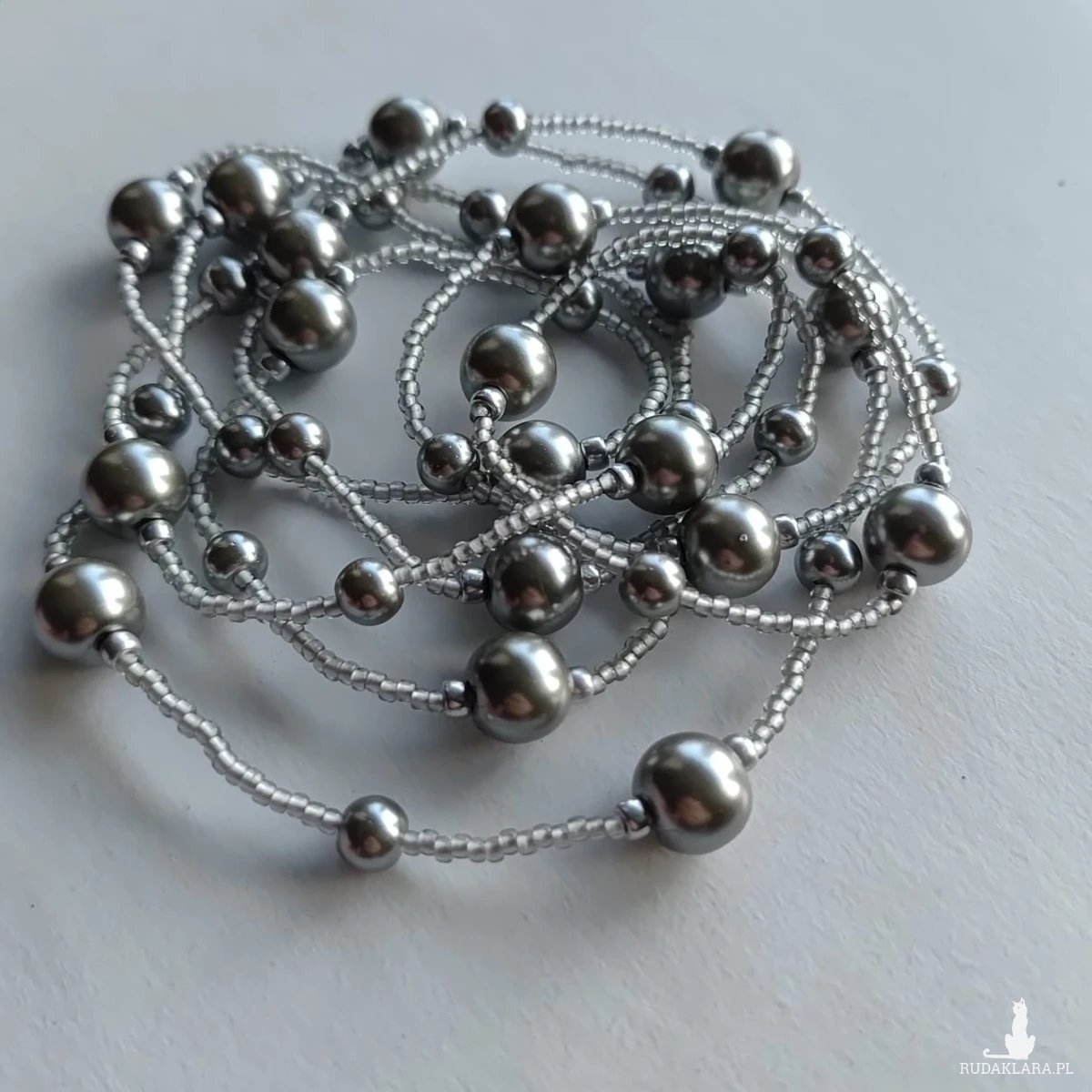 Długi sznur korali perłowych i drobnych koralików japońskich w szarym kolorze. Perła szara 6 i 10 mm, Sznur korali na sznurku syntetycznym. Wygodne zakładanie dla osób starszych przez głowę bez zapięcia. Długość sznura 65 cm, można dwukrotnie owinąć wokół szyi