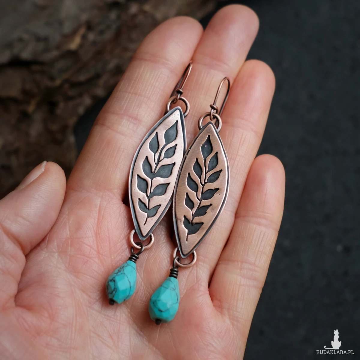 Kolczyki wykonałam ręcznie z miedzianej blachy. Miedź poddałam oksydacji w celu nadania efektu patyny i podkreślenia roślinnego motywu (czerń w zagłębieniach). Kolczyki posiadają przezroczyste zatyczki, co nie jest pokazane na zdjęciach.