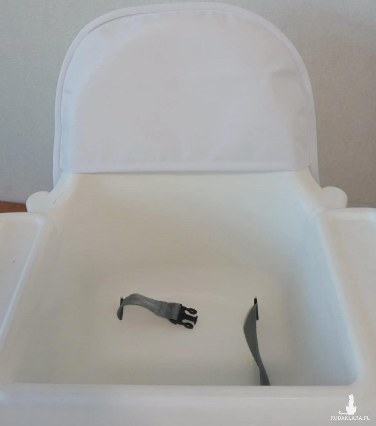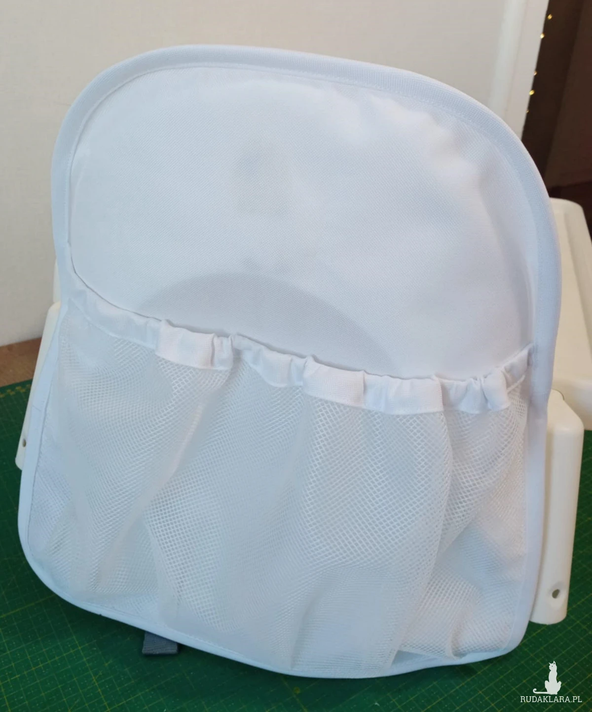 Organizer jest wykonany z tkaniny wodoodpornej w kolorze białym i kieszonką z białej siatki. Możesz wrzucić do niego ściereczkę do wytarcia buzi po posiłku, śliniaczek, butelkę z piciem czy co tam jeszcze jest Ci potrzebne .