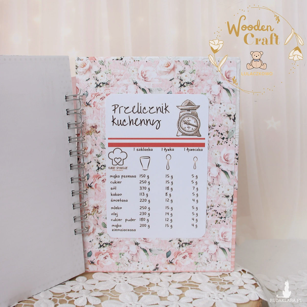 W środku znajduje się 80 kartek na przepisy, na przedniej okładce kieszonka oraz dwie maty na zapiski lub zdjęcia, na tylnej okładce przelicznik kuchenny.