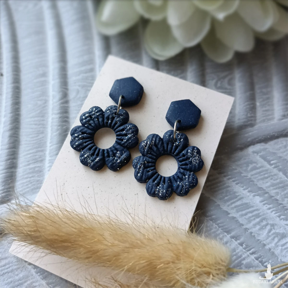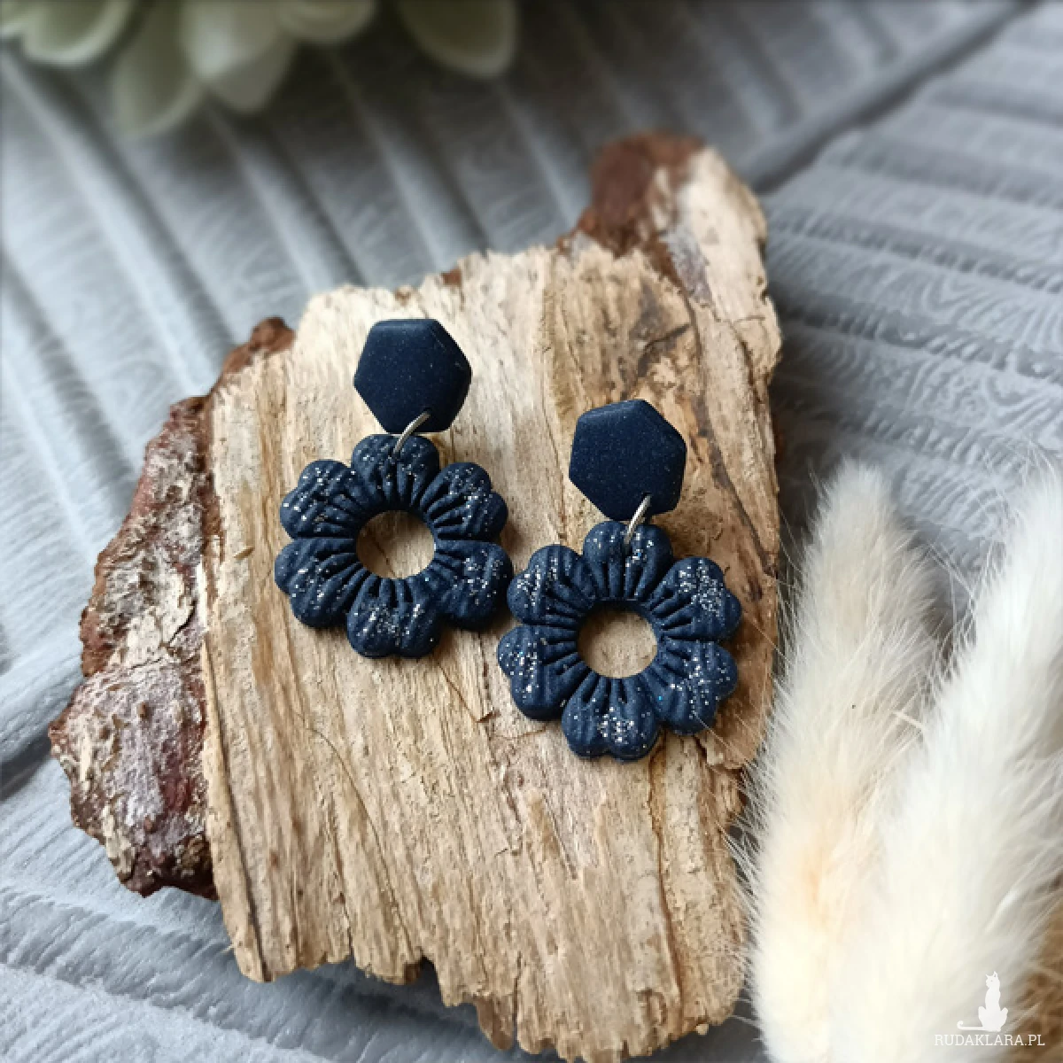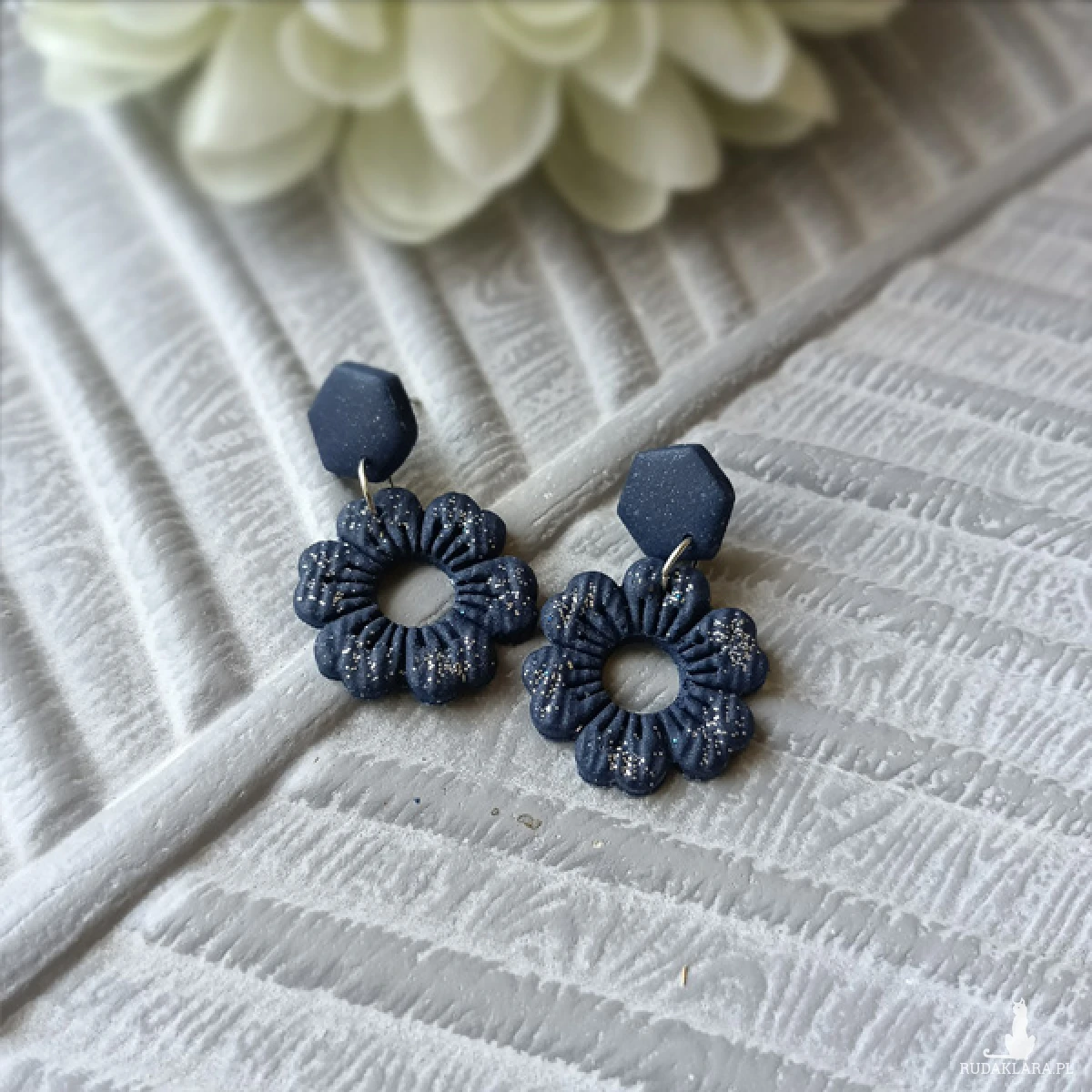 Kolczyki zostały wykonane w całości ręcznie z wysokiej jakości glinki polimerowej. Jest to materiał bardzo trwały, lekki i odporny na wszelkiego rodzaju czynniki zewnętrzne. Kolczyki są w kolorze granatowym z drobinkami brokatu, zawieszone na sztyftach. Elementy metalowe są ze stali chirurgicznej. Całkowita długość kolczyków 3,8 cm, szerokość 2,5 cm. Są bardzo lekkie i pasują do każdej stylizacji na każdą porę dnia. Biżuteria pakowana jest w ozdobne pudełko.