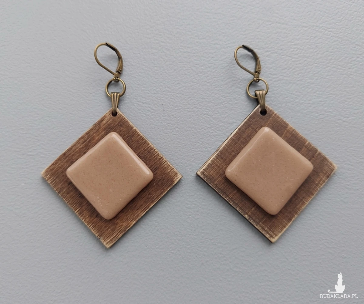 Ręcznie wykonane kolczyki z połączenia drewna i ceramiki. Ceramiczne kaboszony na drewnianych ręcznie malowanych oraz przecieranych płytkach tworzy niepowtarzalny efekt 3D. Geometryczna forma biżuteria jest bardzo modnym motywem.