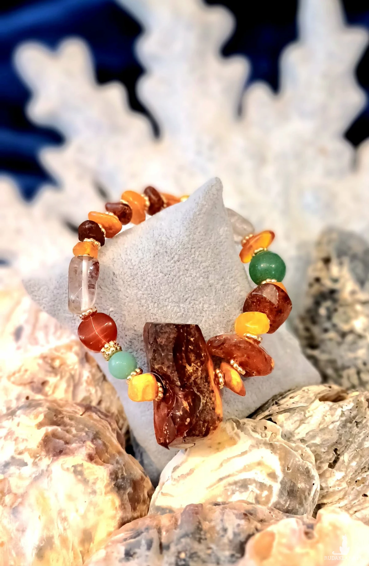 Wyjątkowa bransoletka z pięknym dużym bursztynem - kamieniem szczęścia i początku - połączony z karneolem, jaspisem, awanturynem i kryształem górskim - kamieniami słońca, szczęścia, optymizmu, pasji i energii - idealny prezent na początek roku dla wyjątkowej kobiety !