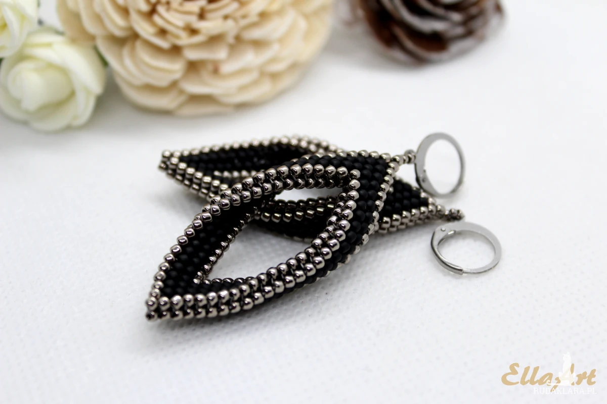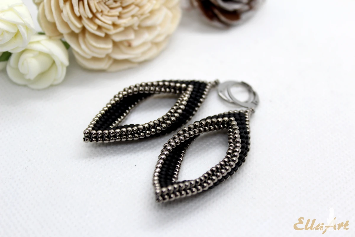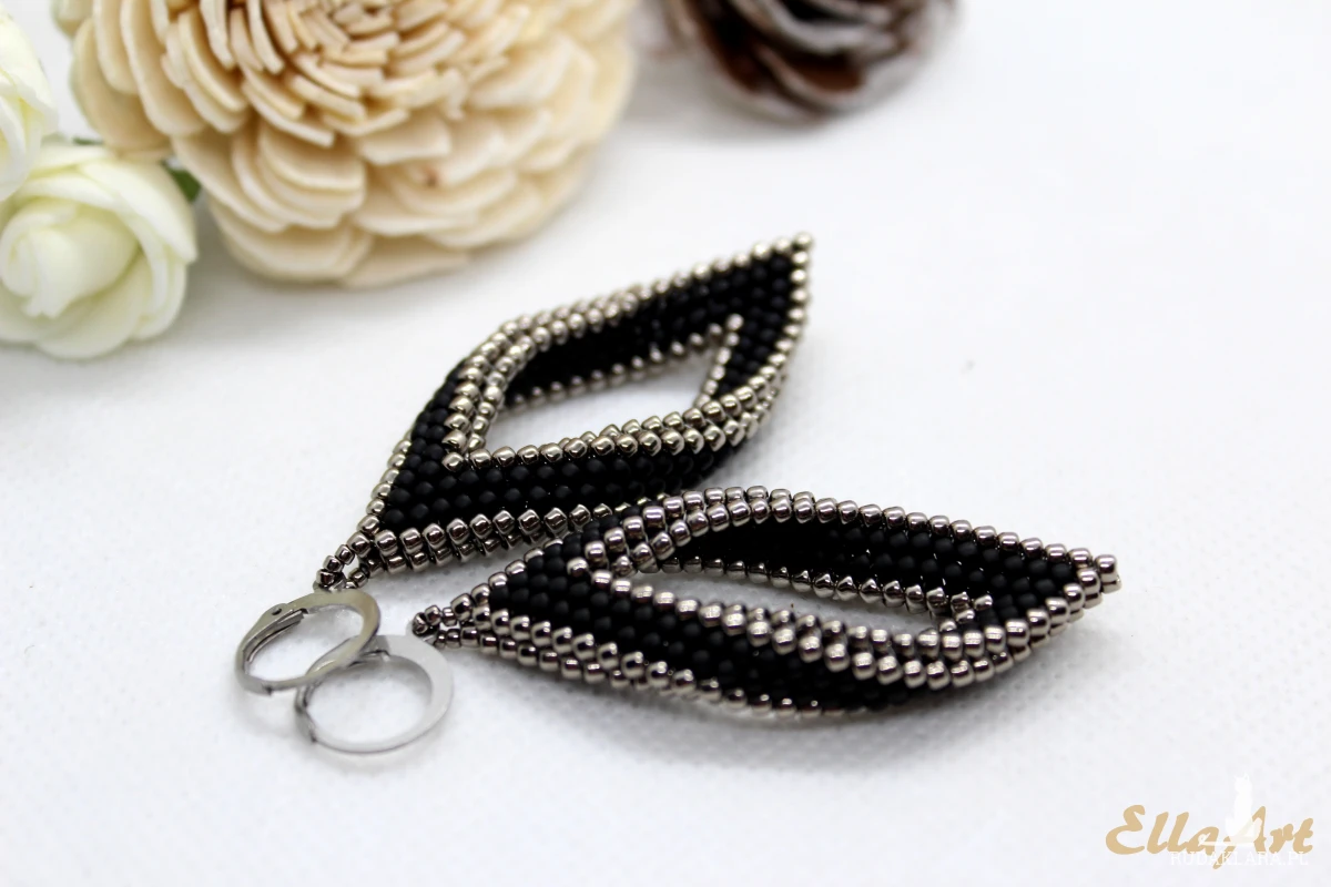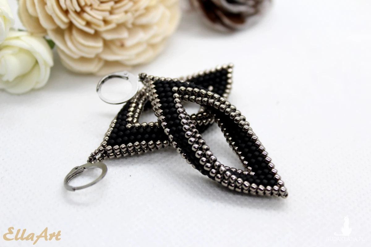 Kolczyki uszyte ręcznie z drobniutkich, japońskich koralików Toho w kolorze matowej czerni i srebra