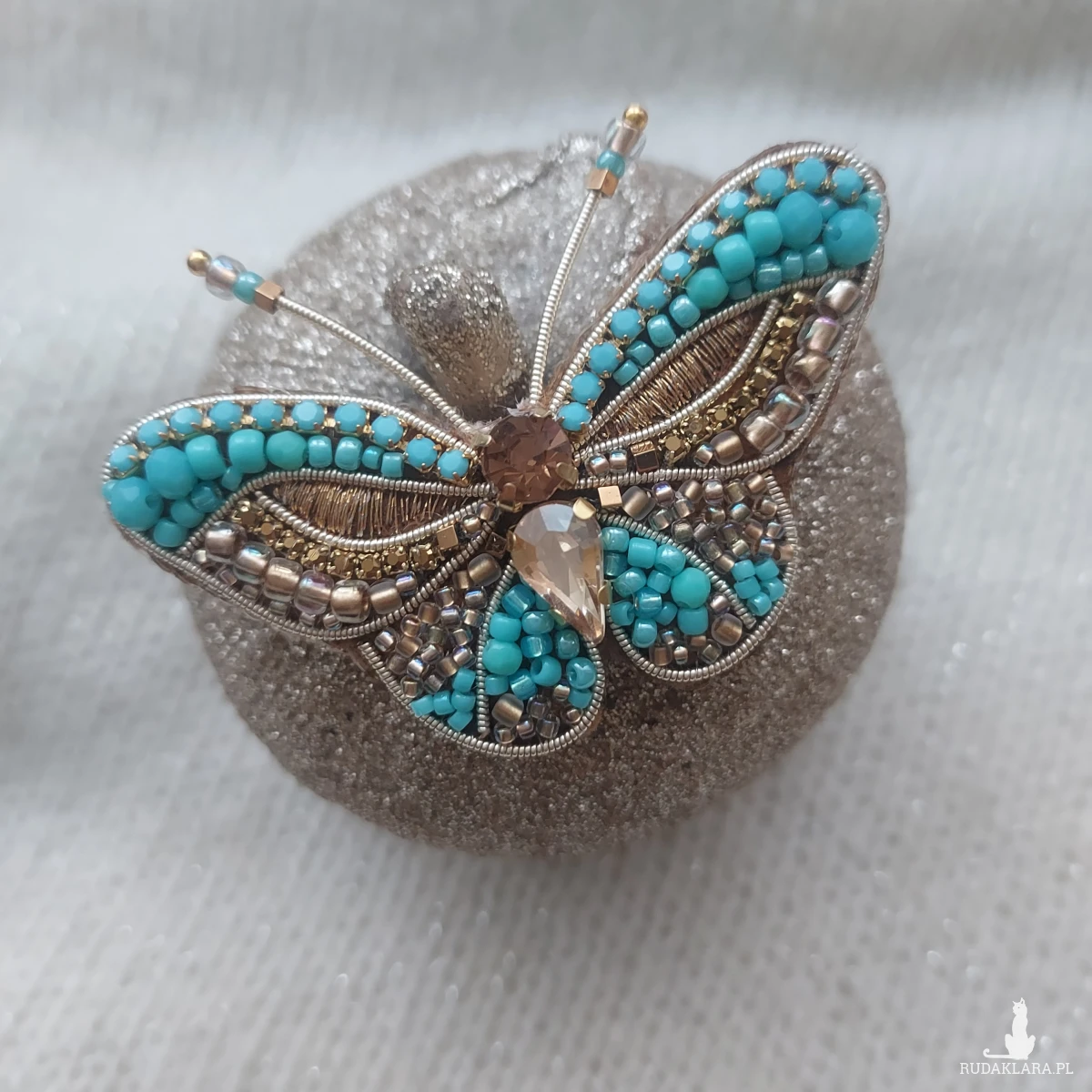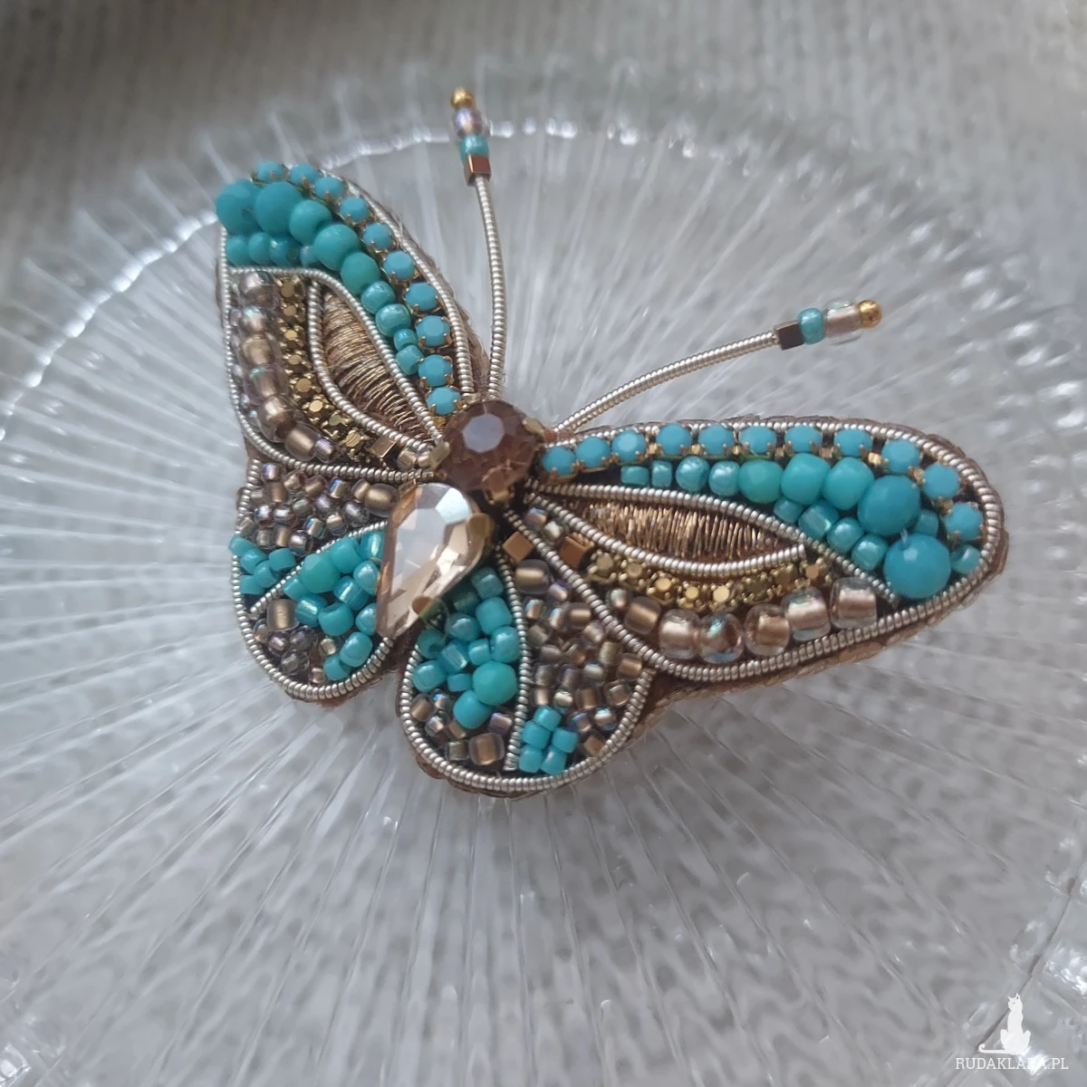 Broszka MOTYL w kolorze turkusu oraz złota powstała techniką haftu koralikowego oraz płaskiego. Przyciągnie niejedno spojrzenie. Zachwycaj nietuzinkowymi dodatkami biżuteryjnymi.