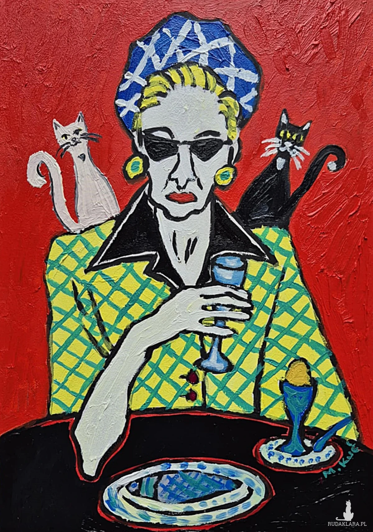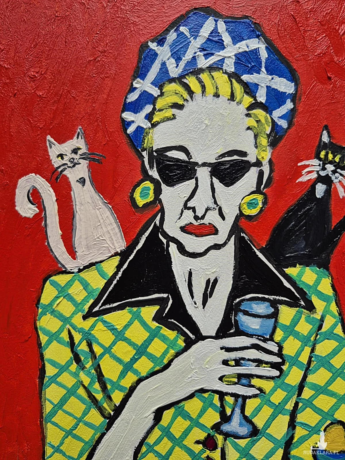 To obraz o wyrazistej, niemal teatralnej sile. Na tle gęstej, chropowatej czerwieni siedzi kobieta o twarzy przypominającej maskę — surowej, nieruchomej, jakby wyrzeźbionej z kamienia. Jej spojrzenie jest ukryte za ciemnymi okularami, co odbiera jej indywidualność i czyni ją symbolem raczej niż portretem konkretnej osoby. Czerwień ust stanowi jedyny ciepły akcent na bladej twarzy, jak znak życia w chłodnej formie.