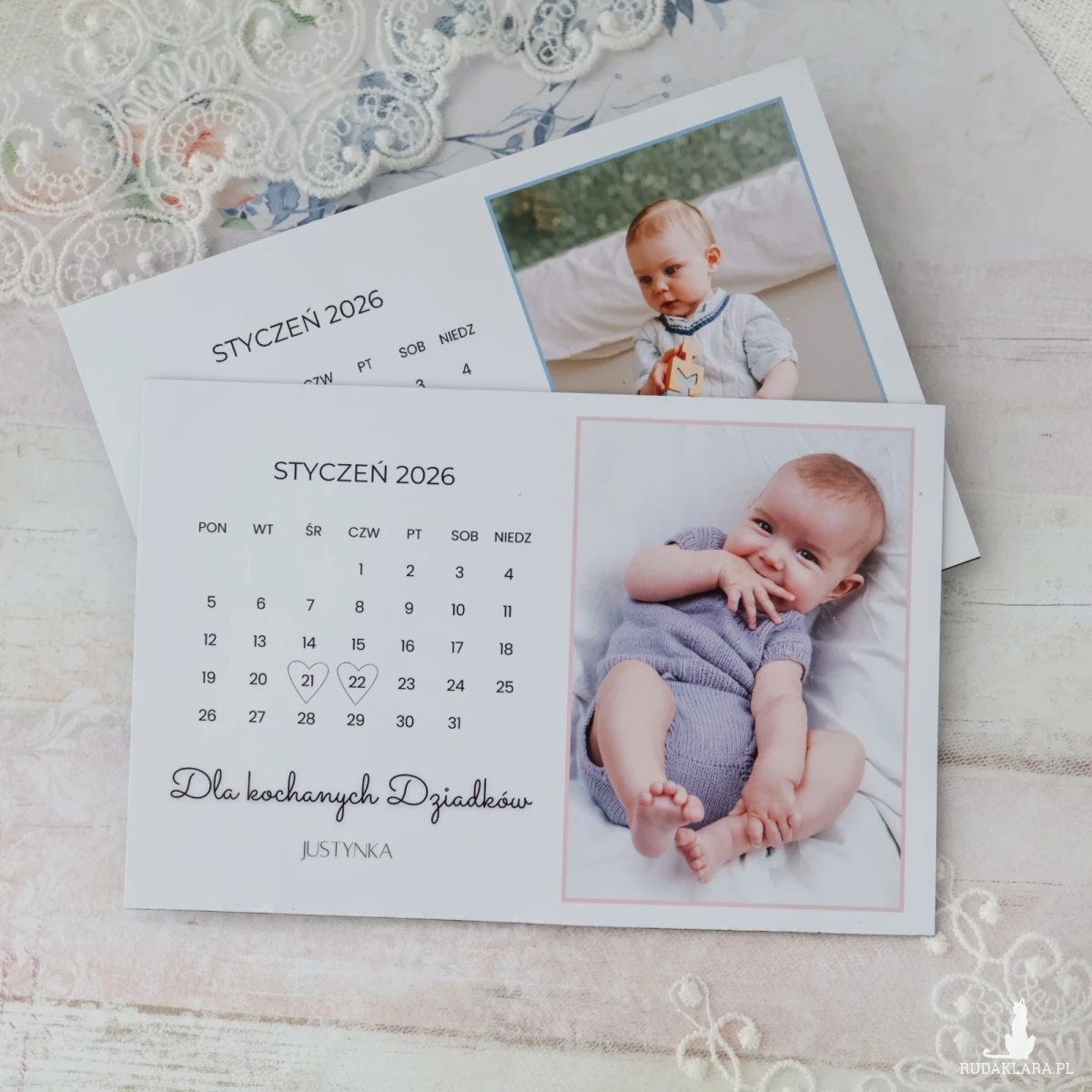Do wyboru są dwa kolory obramowania: różowy lub niebieski, co pozwala dopasować kartkę do stylu wnętrza oraz charakteru zdjęcia.