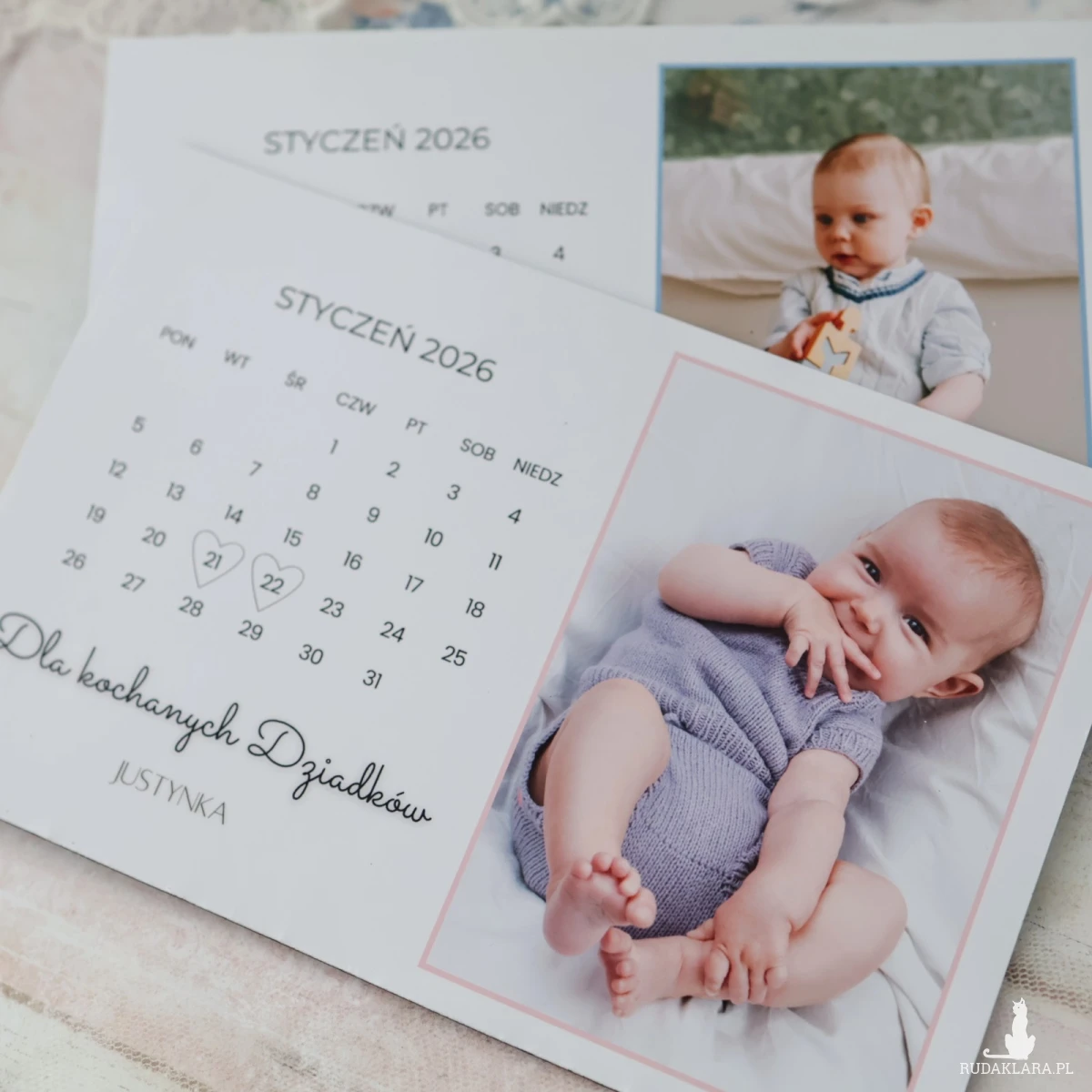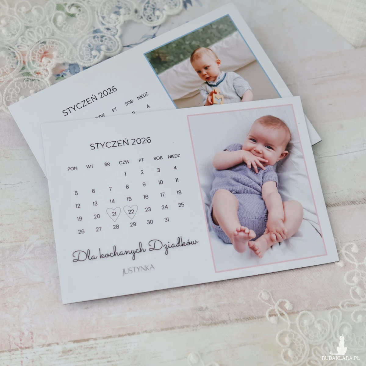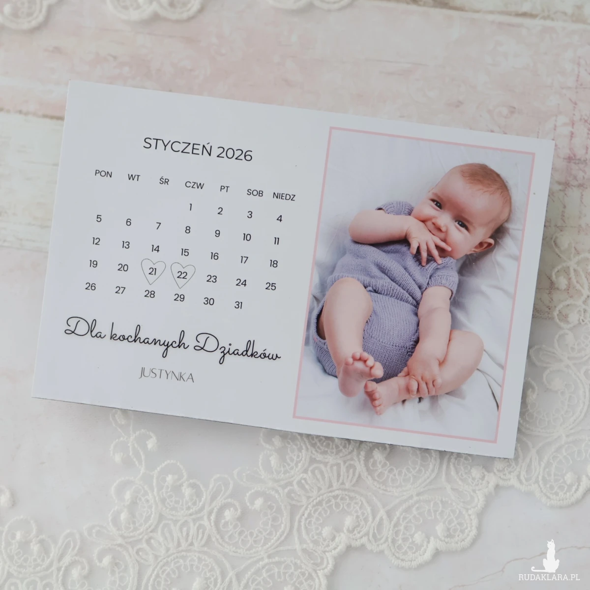 Na kartce znajduje się zdjęcie dziecka/dzieci oraz kartka z kalendarza z zaznaczoną datą Dnia Babci i Dziadka, co w prosty, ale bardzo ciepły sposób pokazuje, że ten dzień jest ważny i zapamiętany.
