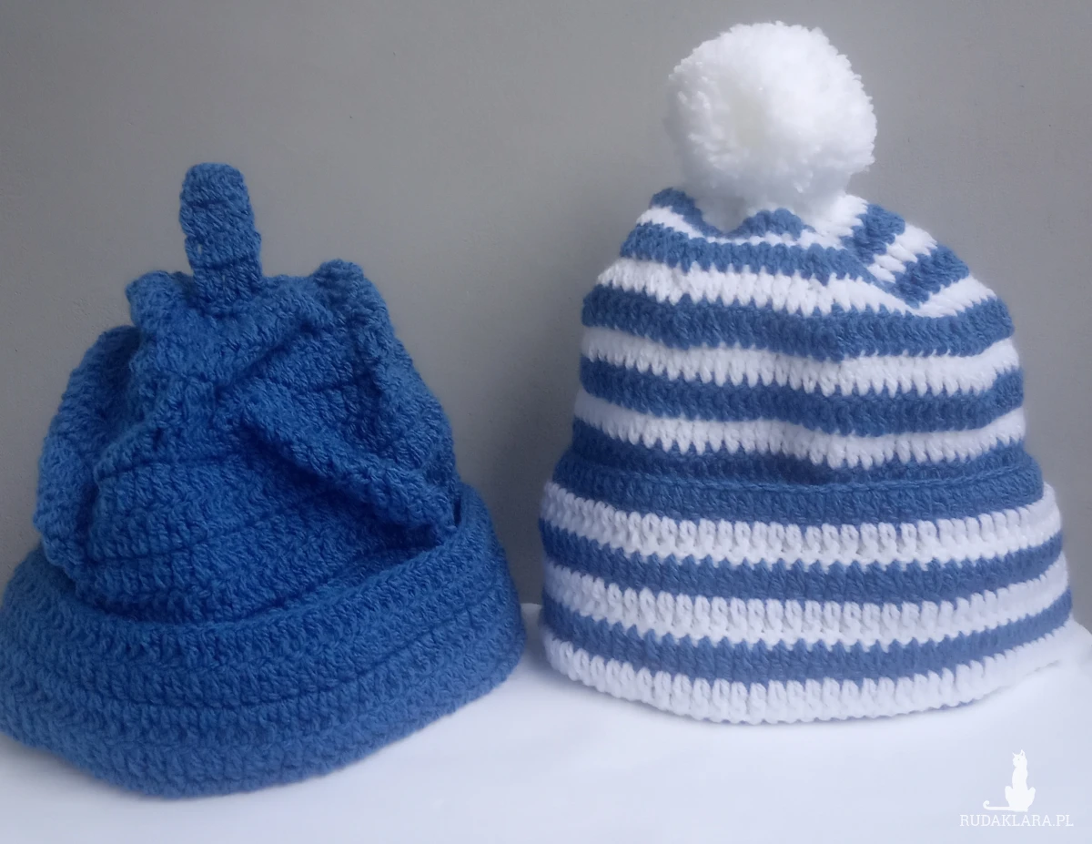Czapki jak z bajki SĄSIEDZI, czyli czapka Pata i Mata zrobione ręcznie na szydełku z włóczki w składzie 100 % akryl w kolorach niebieskim i białym. Rozmiar męski uniwersalny. Prać ręcznie w temperaturze 30 stopni, suszyć na leżąco.