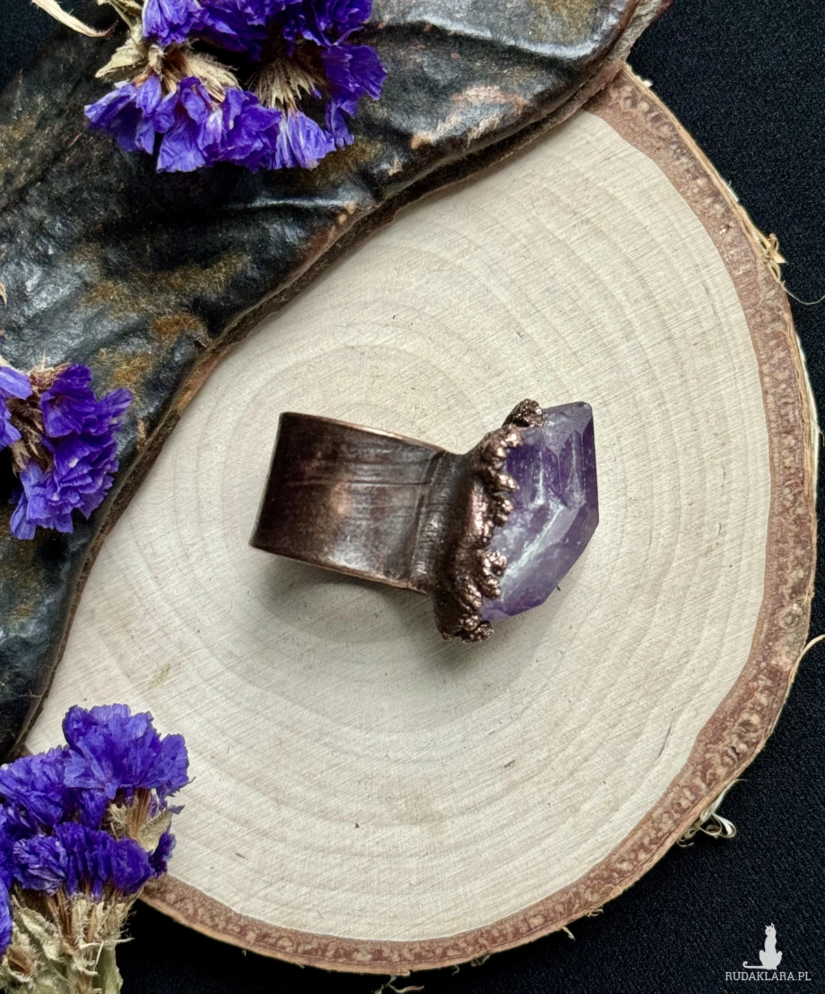 Miedziany pierścień z ametystem. Rozmiar 27 (obwód 67mm)