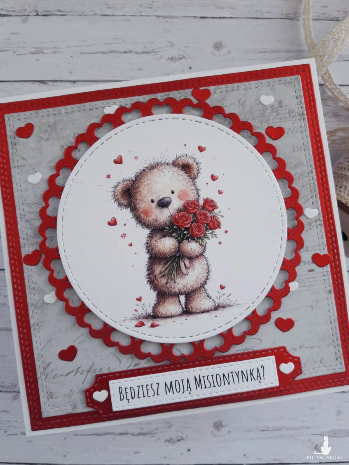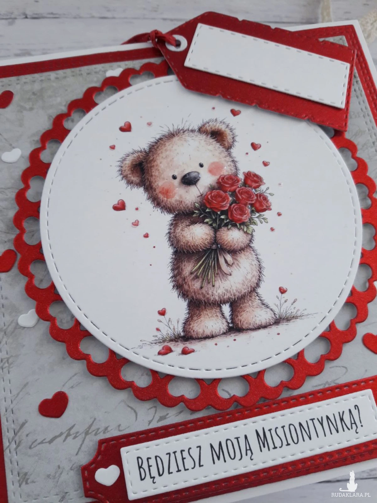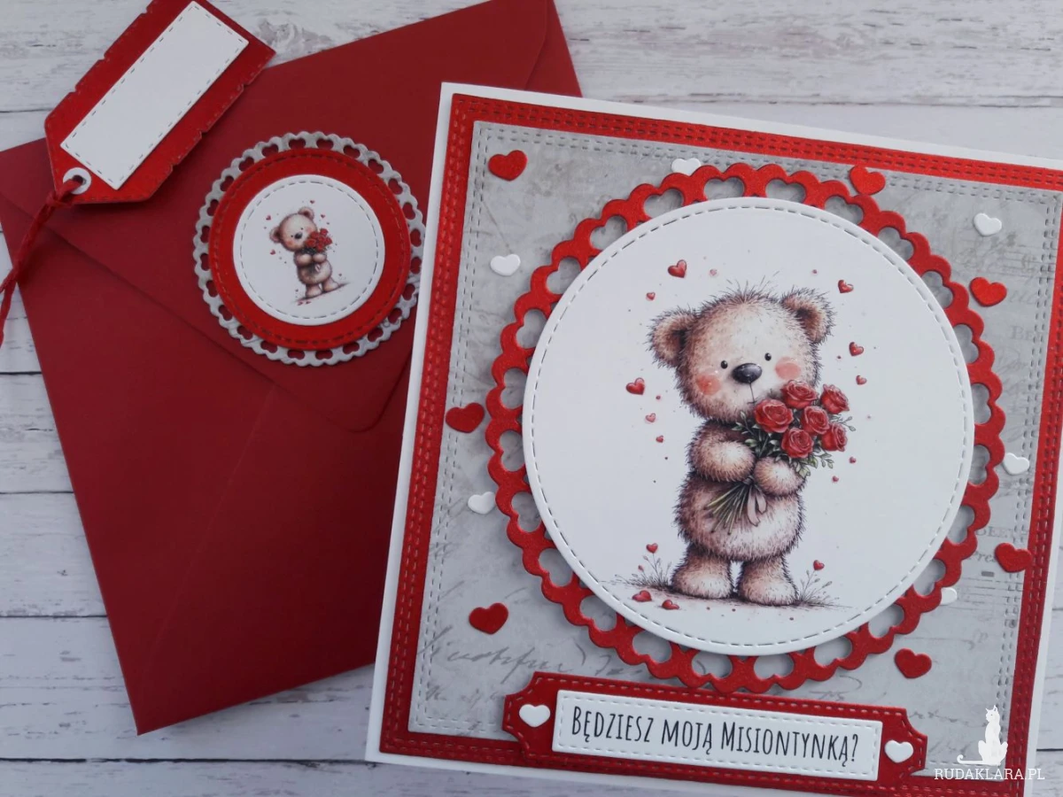 Ręcznie robiona kartka walentynkowa z uroczym misiem wykonana metodą scrapbookingu z wykorzystaniem profesjonalnych materiałów i z dbałością o każdy szczegół.