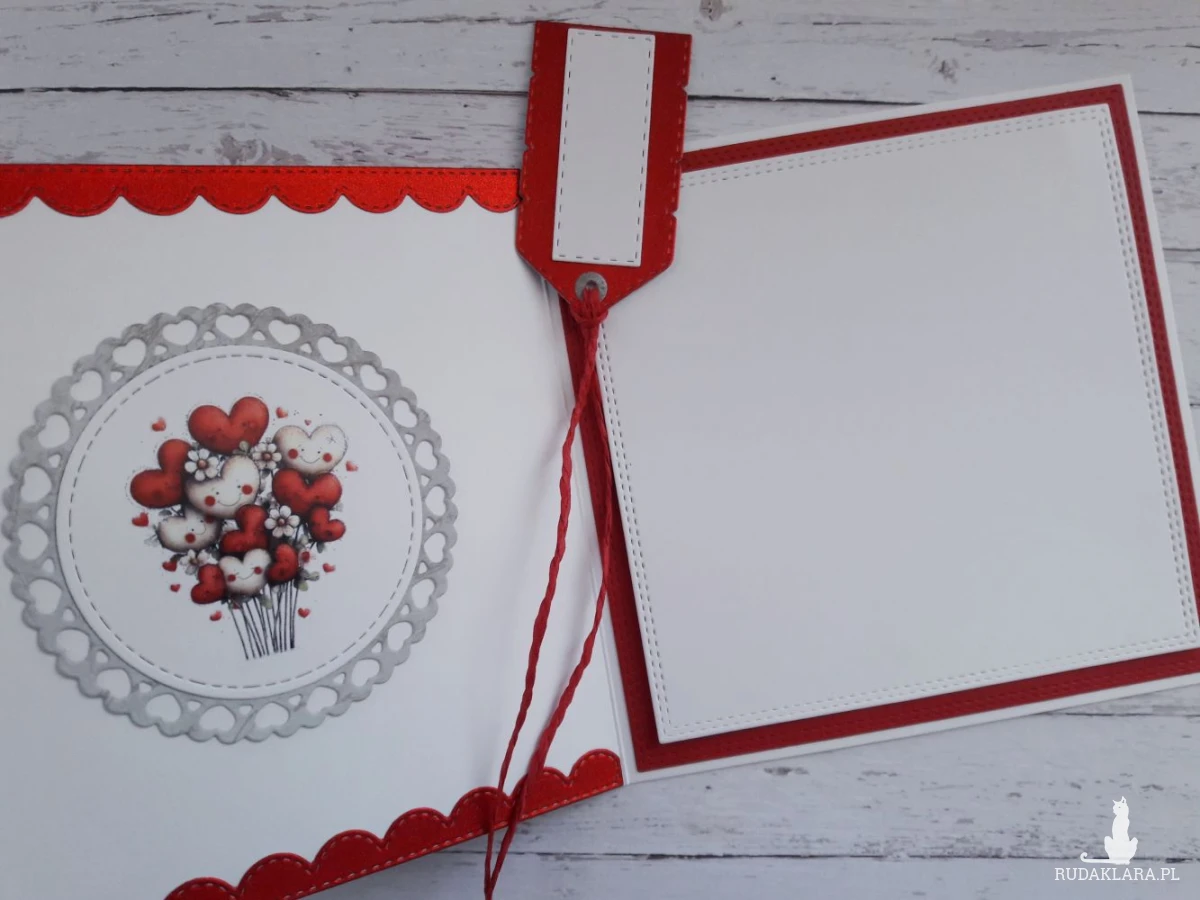 Do kartki dołączam GRATIS w postaci widocznej na zdjęciu etykietki, za pomocą której można podpisać upominek walentynkowy i przyczepić ją do wstążki, którą obwiązany jest prezent, za pomocą sznureczka, który również znajduje się w zestawie.