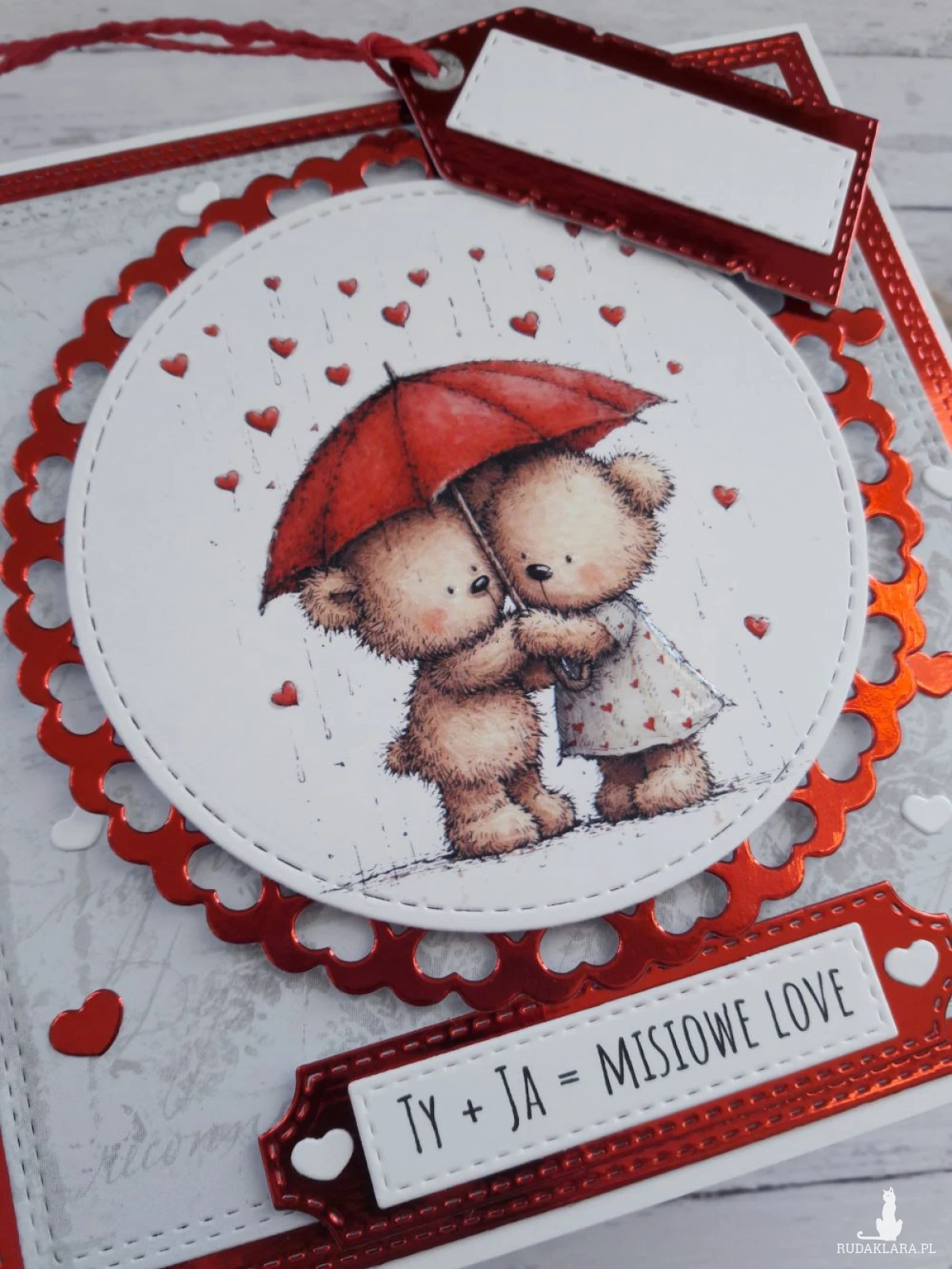 Ręcznie robiona kartka walentynkowa z uroczymi misiami pod parasolką wykonana metodą scrapbookingu z wykorzystaniem profesjonalnych materiałów i z dbałością o każdy szczegół.