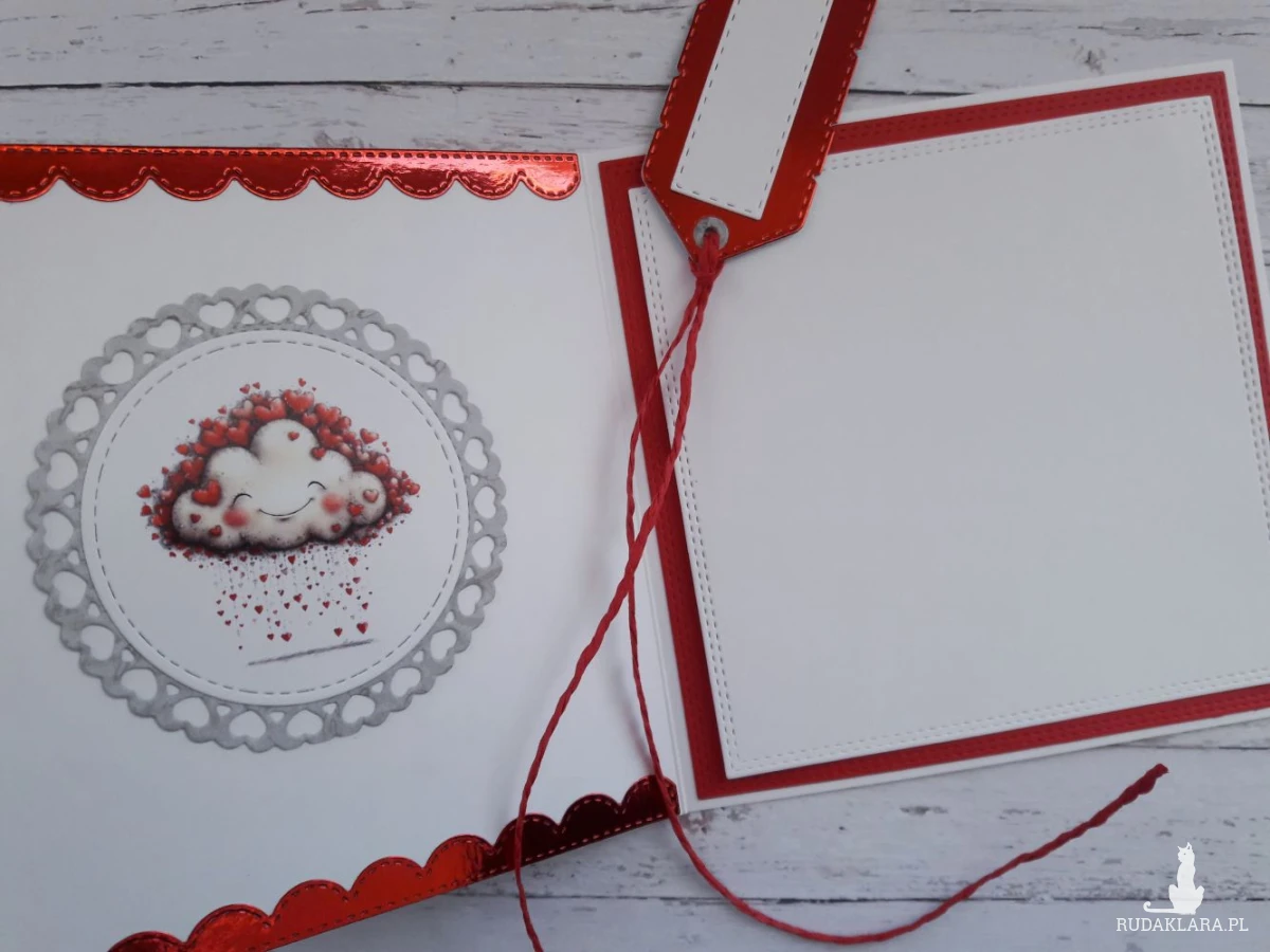 Do kartki dołączam GRATIS w postaci widocznej na zdjęciu etykietki, za pomocą której można podpisać upominek walentynkowy i przyczepić ją do wstążki, którą obwiązany jest prezent, za pomocą sznureczka, który również znajduje się w zestawie.
