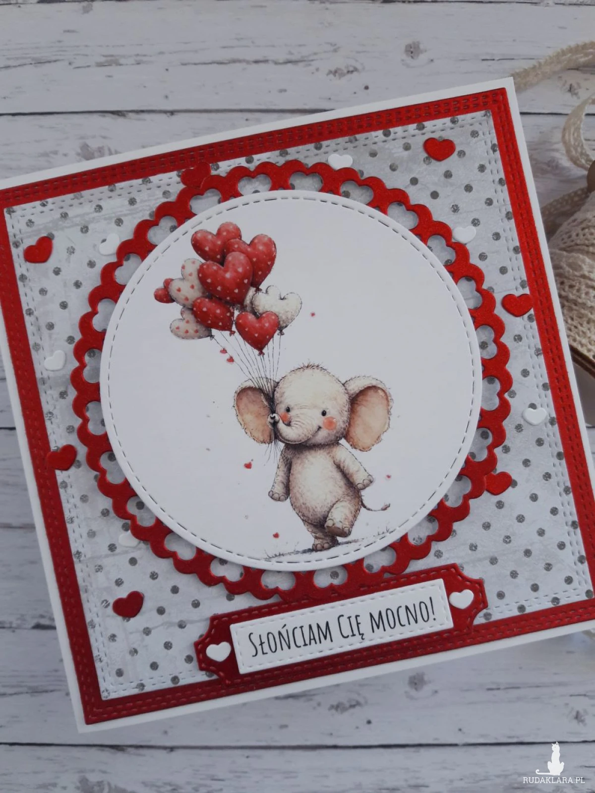 Ręcznie robiona kartka walentynkowa z uroczym słoniem wykonana metodą scrapbookingu z wykorzystaniem profesjonalnych materiałów i z dbałością o każdy szczegół.