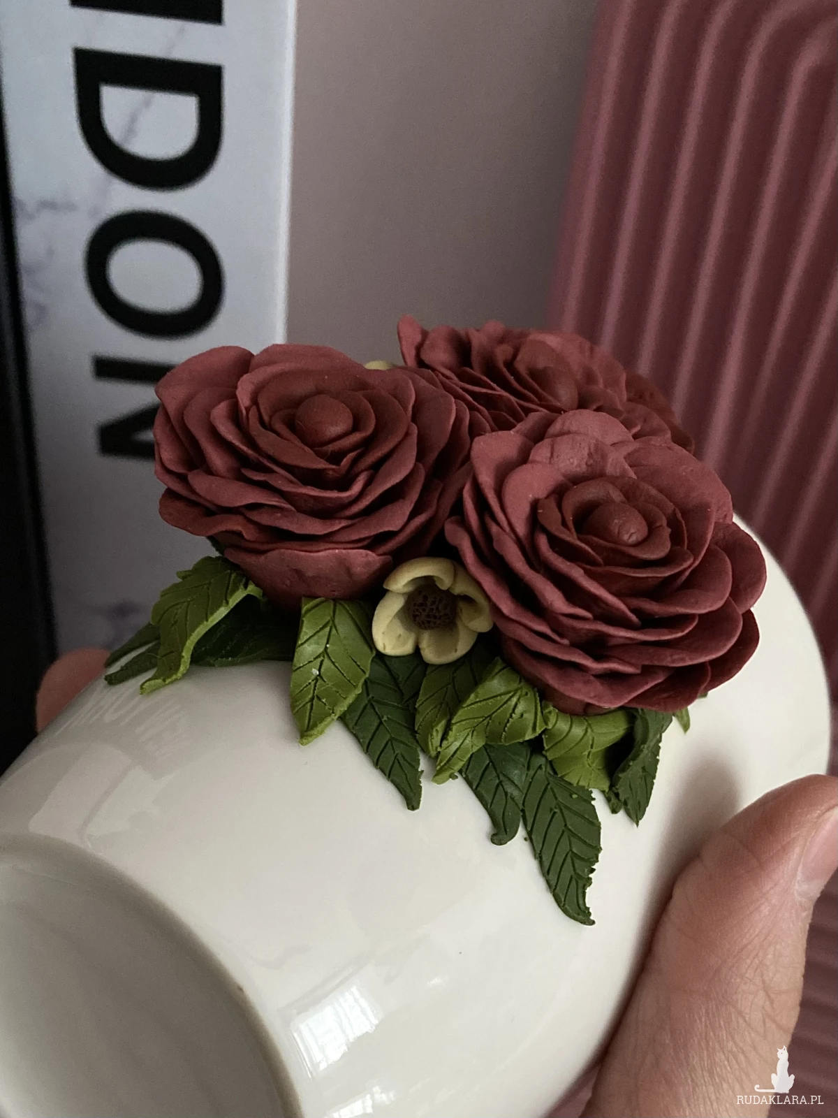 Kubek ceramiczny w kolorze złamanej bieli/ kości słoniowej/ kremowym z ręcznie tworzonym dekorem z gliny polimerowej