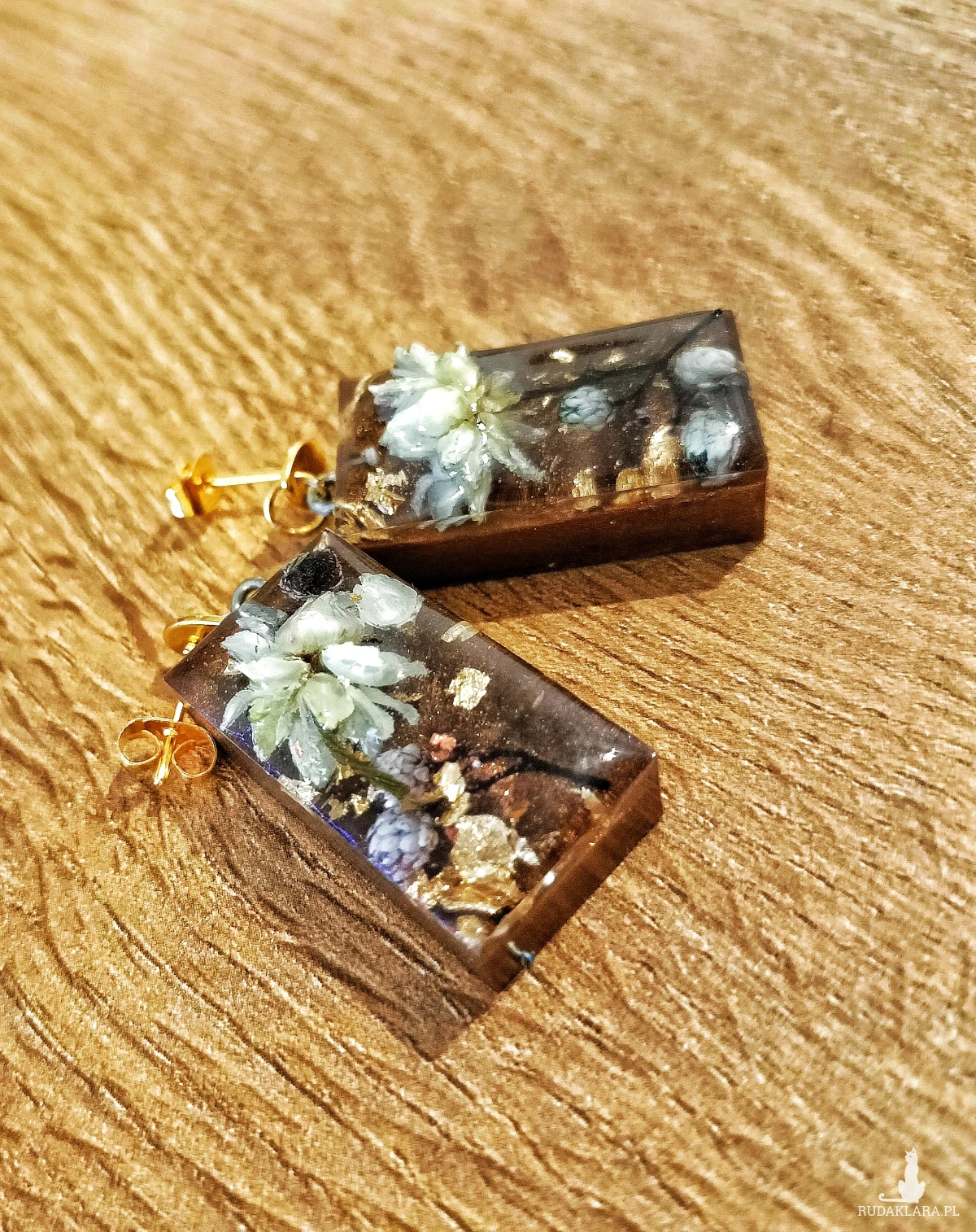 Oferuję wyjątkowe kolczyki ręcznie wykonane, w których zatopiono prawdziwe suszone białe kwiaty kocanki oraz niebieski kwiat ryżu. Kompozycję dopełnia transparentna i perłowa, brązowa, delikatnie mieniąca się żywica Resin Pro oraz złote drobinki, nadające całości eleganckiego blasku.