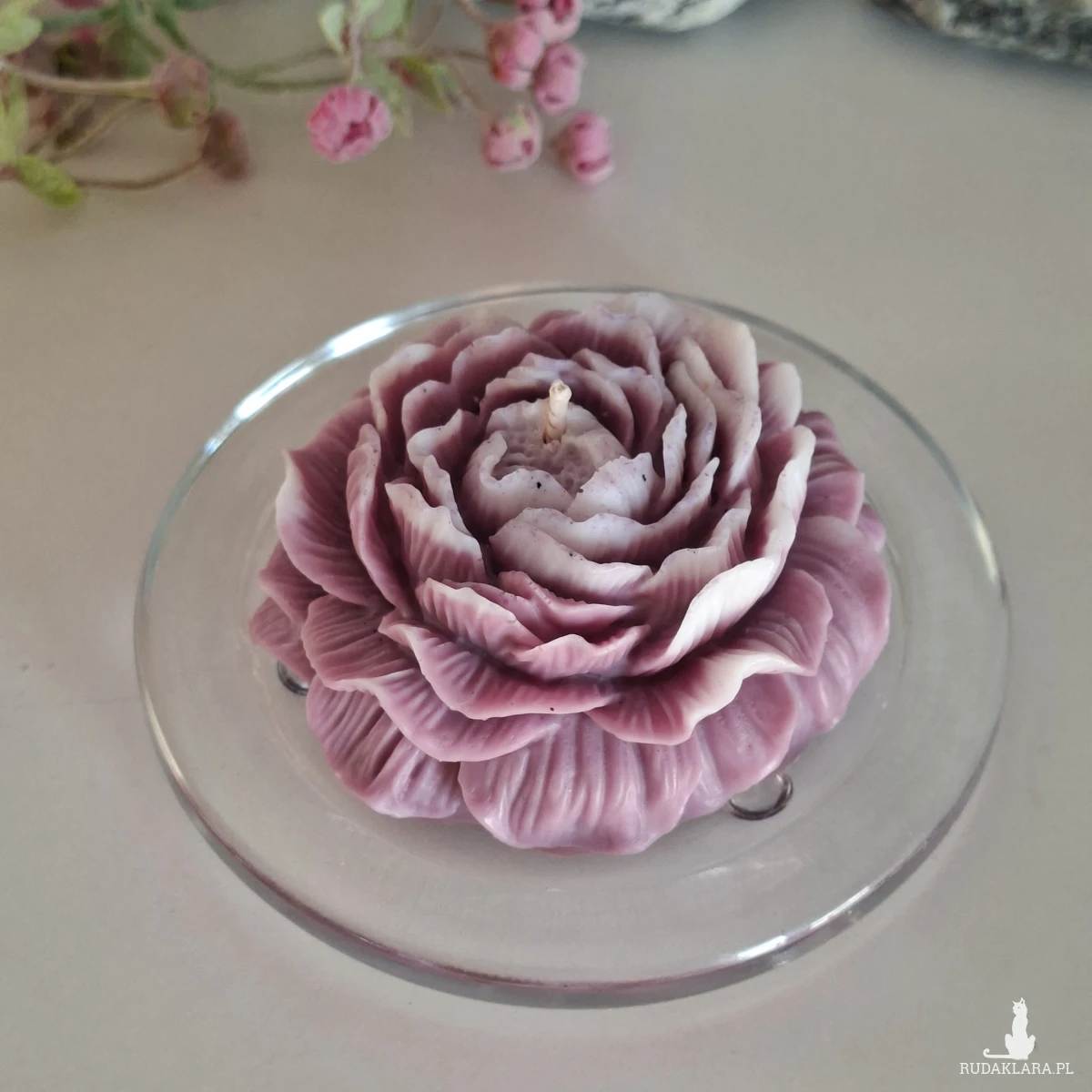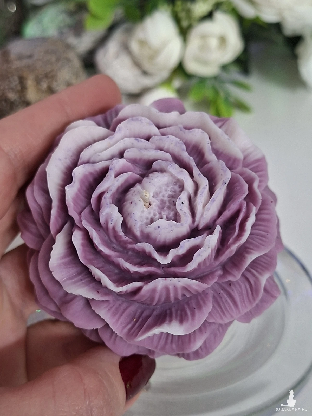 Świeca zapachowa w kształcie piwonii o zapachu piwonii i kawy. Idealna jako upominek w ramach podziękowania dla gości na specjalne okazje. Wymiary: średnica 7,5 cm; wysokość 3,5 cm.