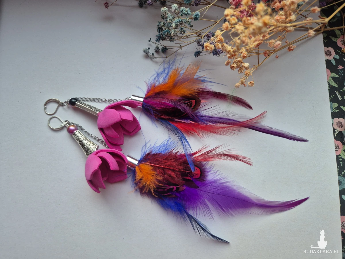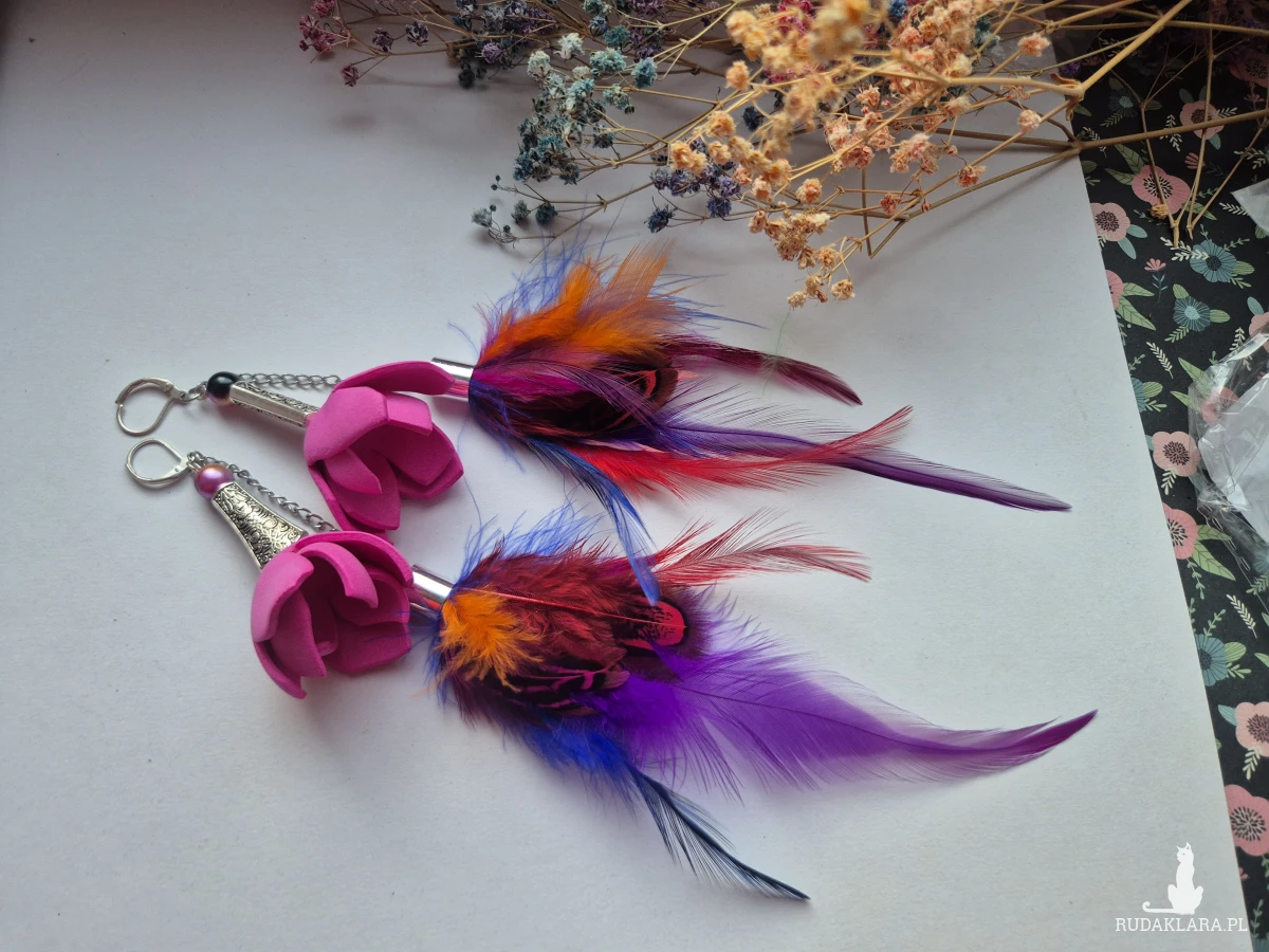Kolczyki kolorowe energetyczne  pióra duże lekkie wykonane w pojedynczym egzemplarzu rękodzieło