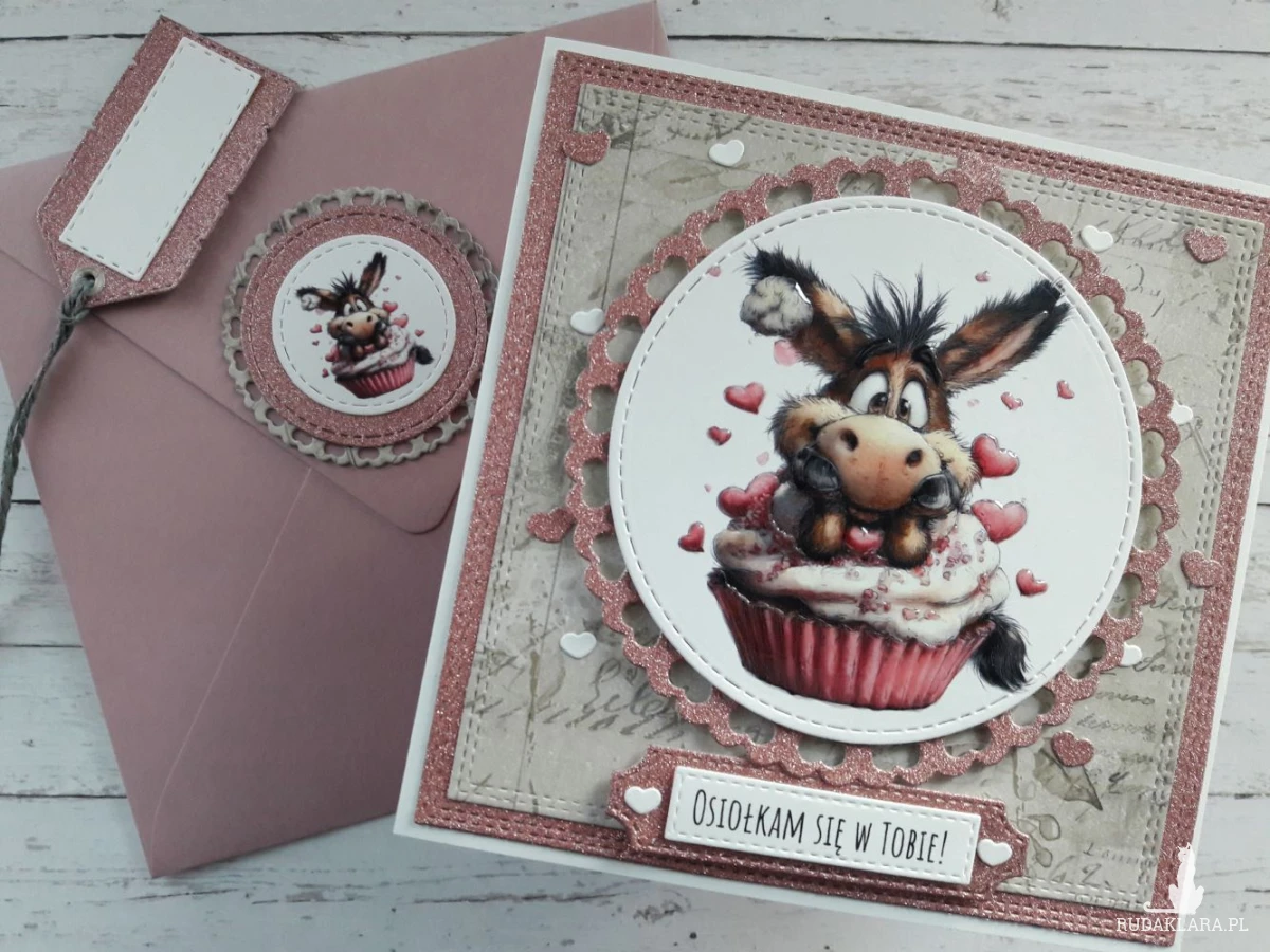 Ręcznie robiona kartka walentynkowa z uroczym osiołkiem wykonana metodą scrapbookingu z wykorzystaniem profesjonalnych materiałów i z dbałością o każdy szczegół.