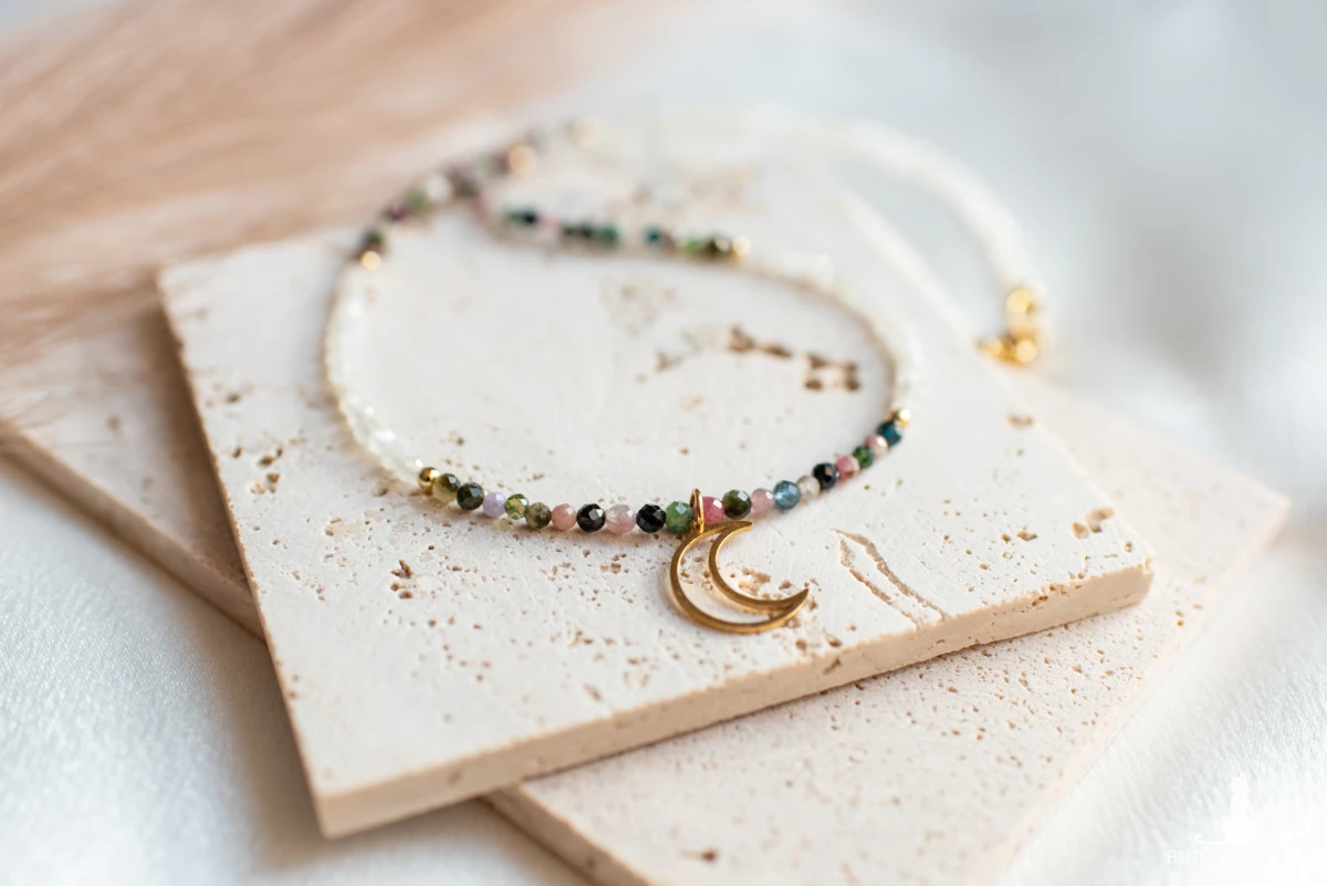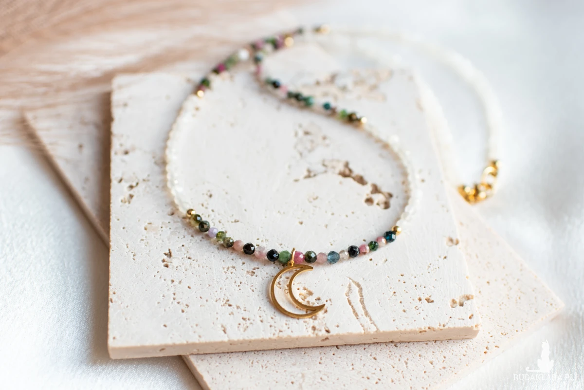 Turmalin symbolizuje ochronę i równowagę, a kamień księżycowy - intuicję, wrażliwość i kobiecą energię.