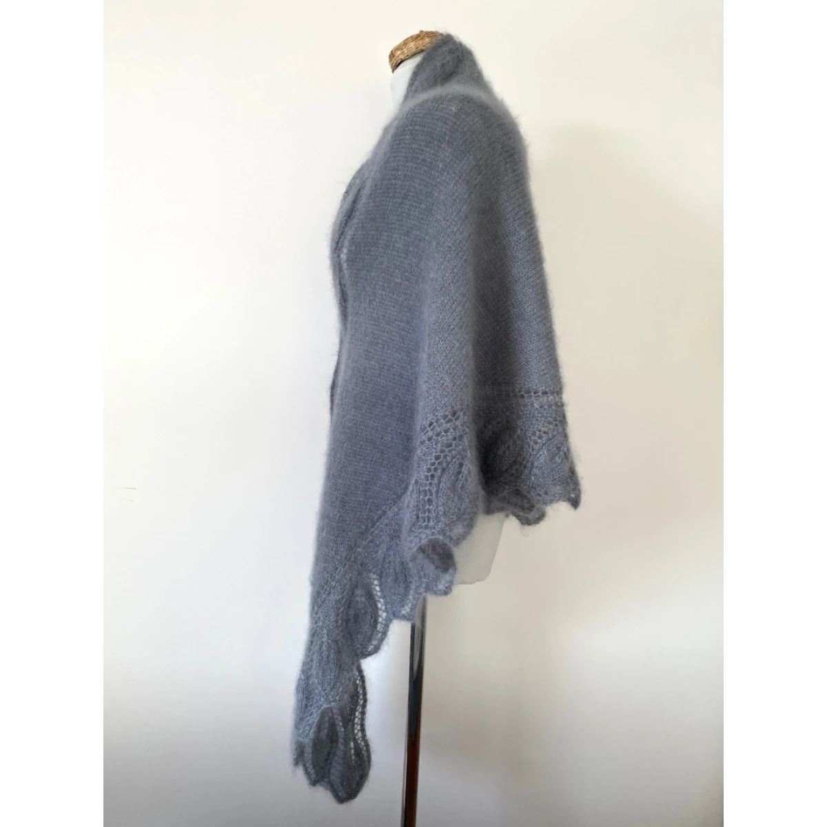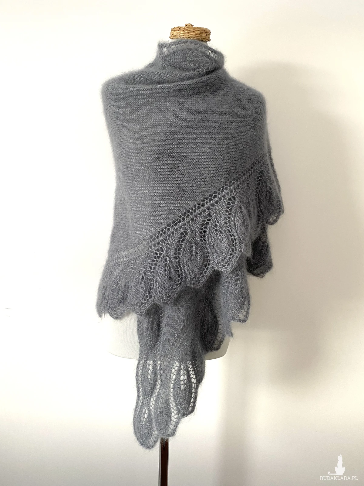 Szal, etola wykonana na drutach w jednym kawałku, łącznie z obramowaniem i lamówką. Wykonany z bardzo miękkiej i luksusowej włóczki – mieszanki moheru i jedwabiu.