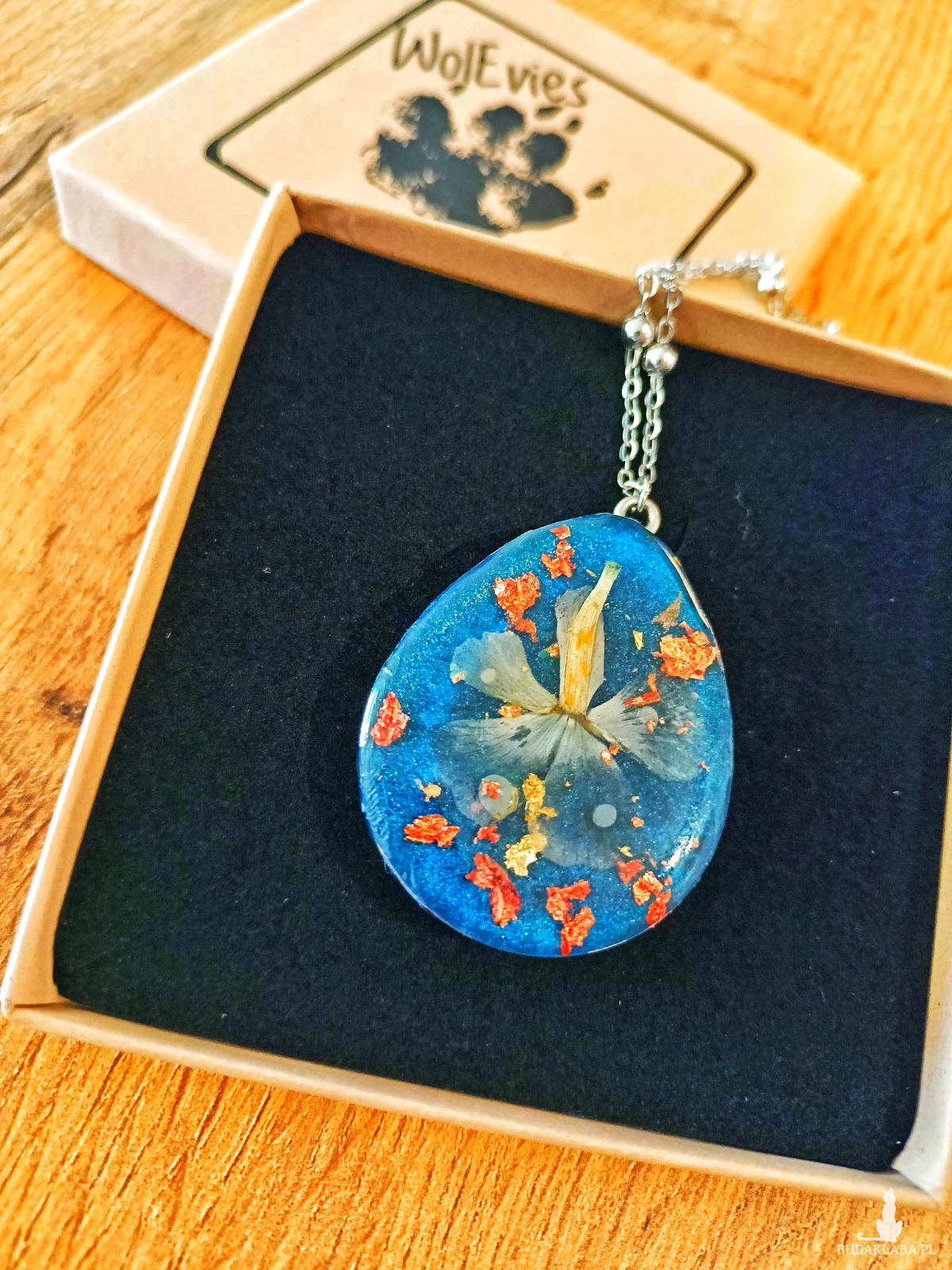 Oferuję unikatowy wisiorek ręcznie wykonany z wysokiej jakości żywicy Resin Pro. W centrum znajduje się prawdziwy suszony biały kwiat, zatopiony w połączeniu transparentnej i granatowej, delikatnie mieniącej się żywicy, uzupełnionej drobinkami koloru miedzi. Całość tworzy elegancką, ponadczasową kompozycję inspirowaną naturą.