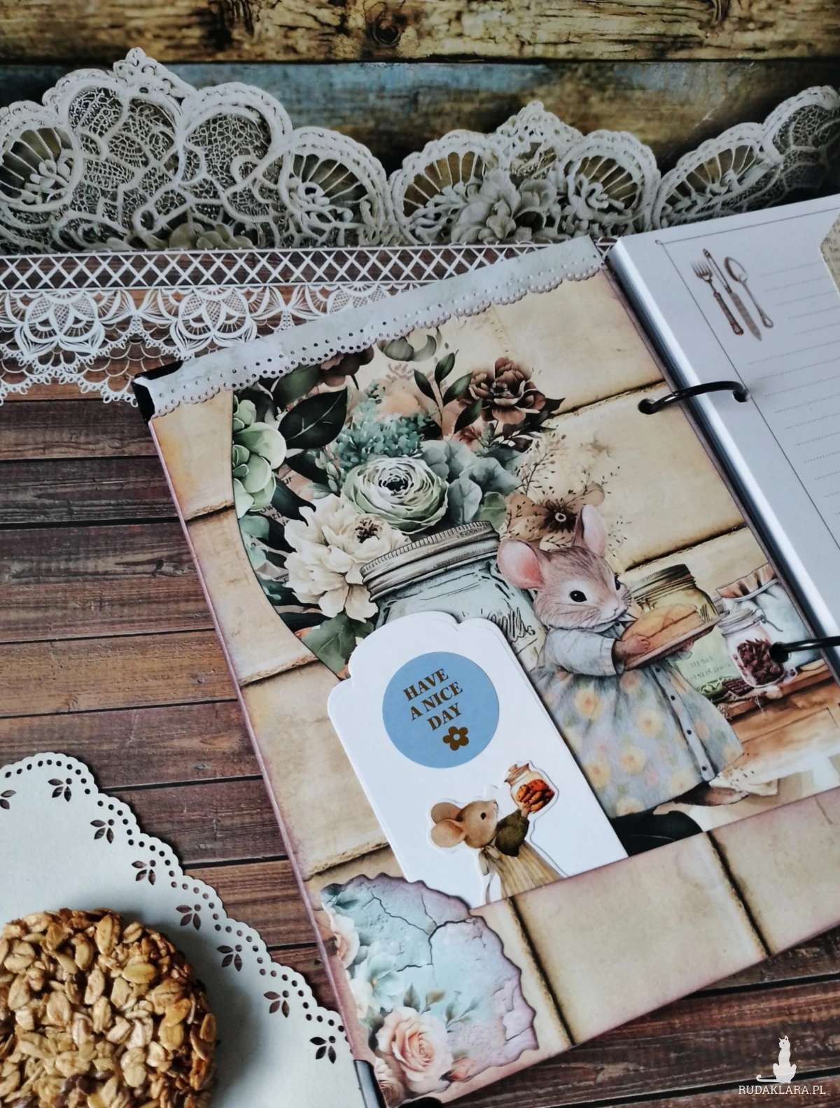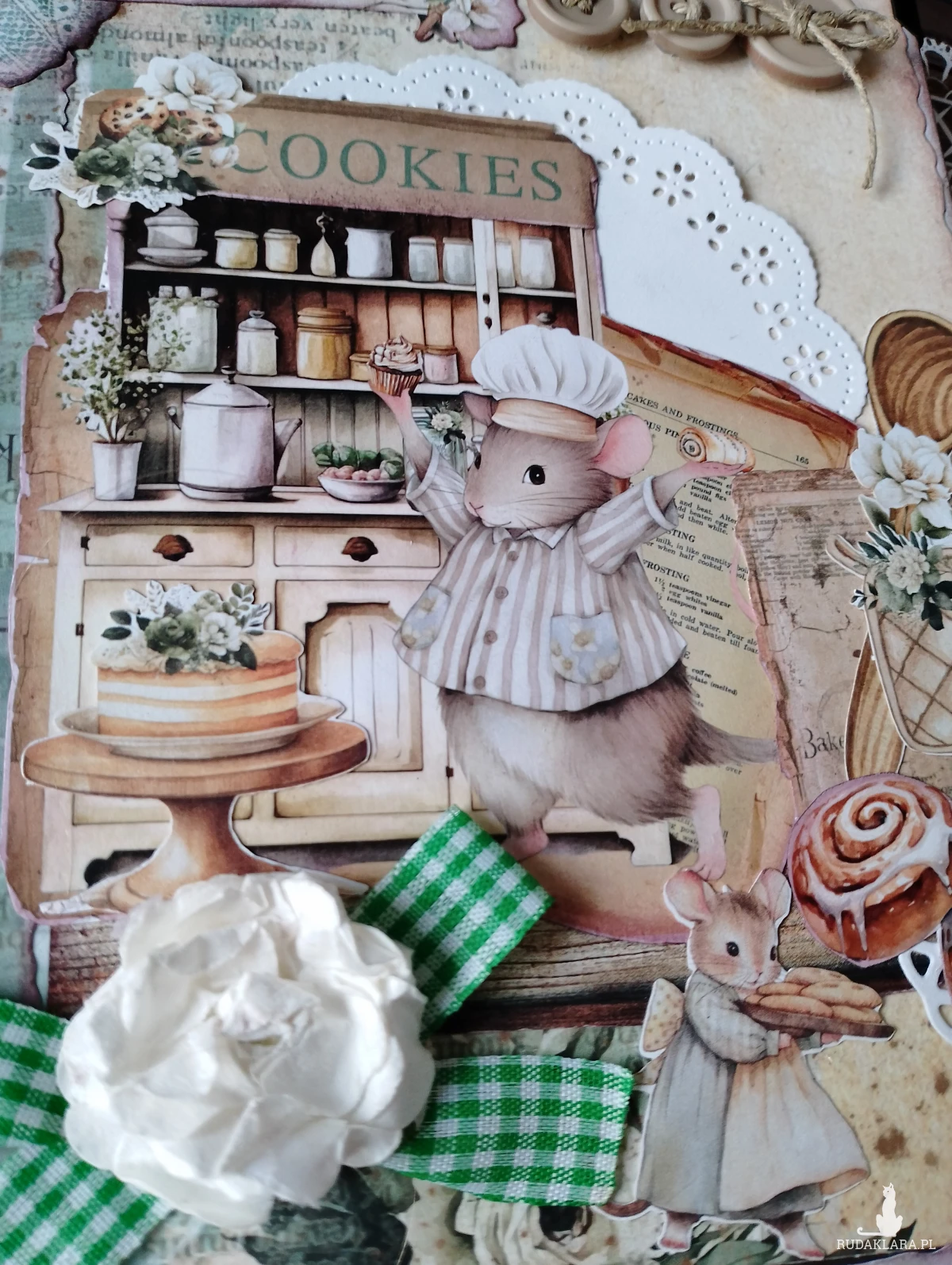 Unikalny design oddaje istotę tradycyjnego domowego pieczenia, z obrazkami rustykalnego klimatu, wspaniałych kwiatów, myszek kucharek i słodkich smakołyków, wszystko w przytulnej palecie kolorów przypominającej klasyczną wiejską kuchnię.