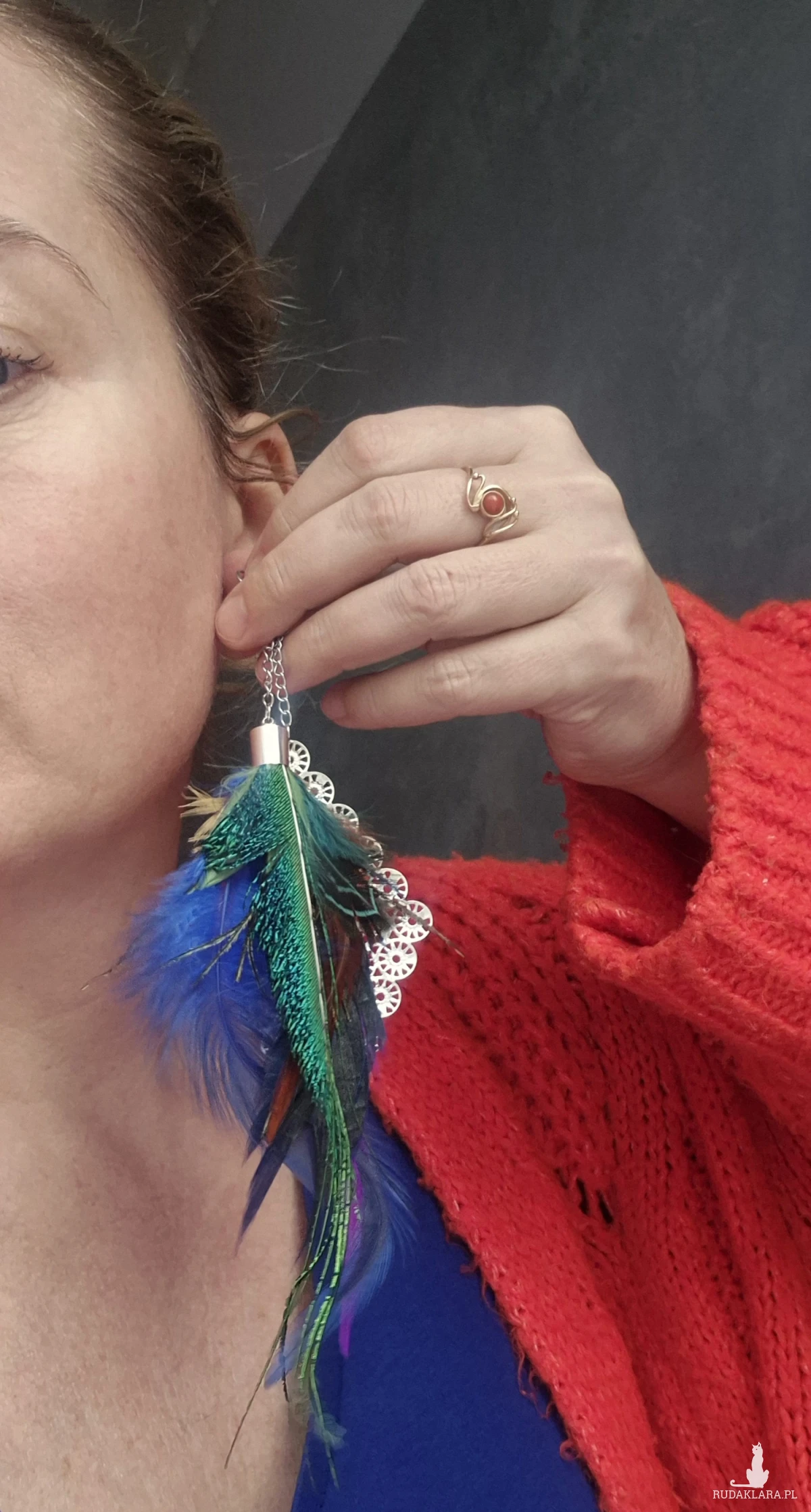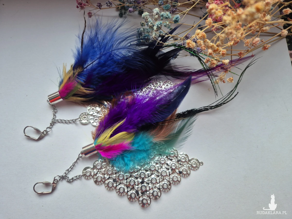 Kolczyki kolorowe energetyczne  pióra duże lekkie wykonane w pojedynczym egzemplarzu rękodzieło