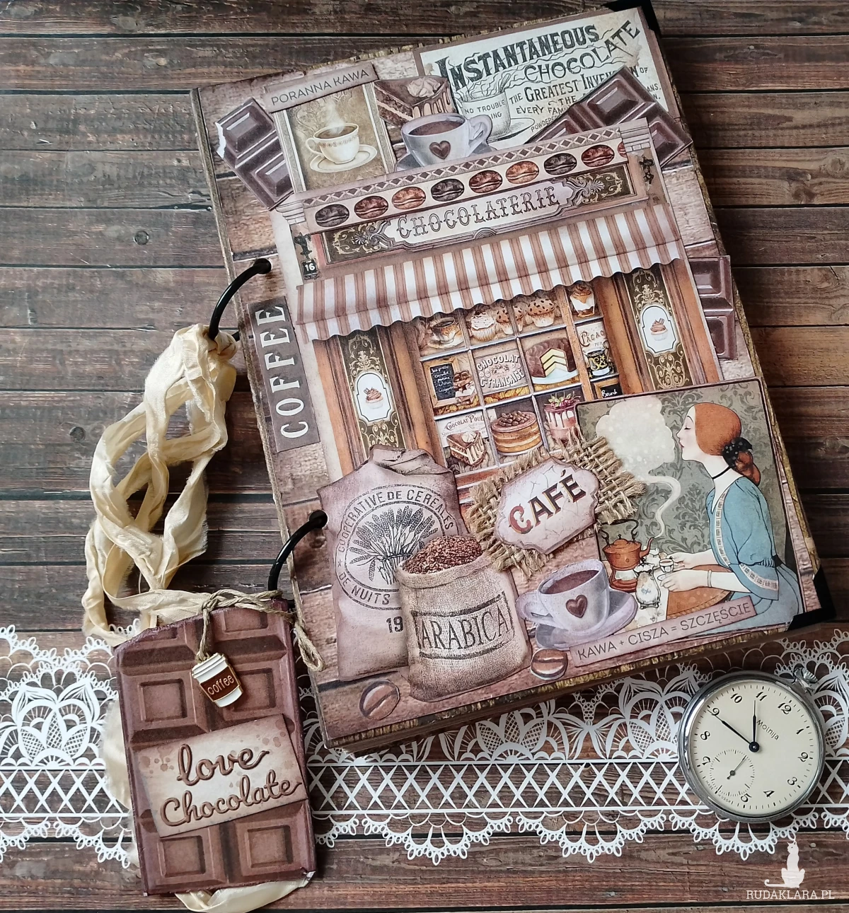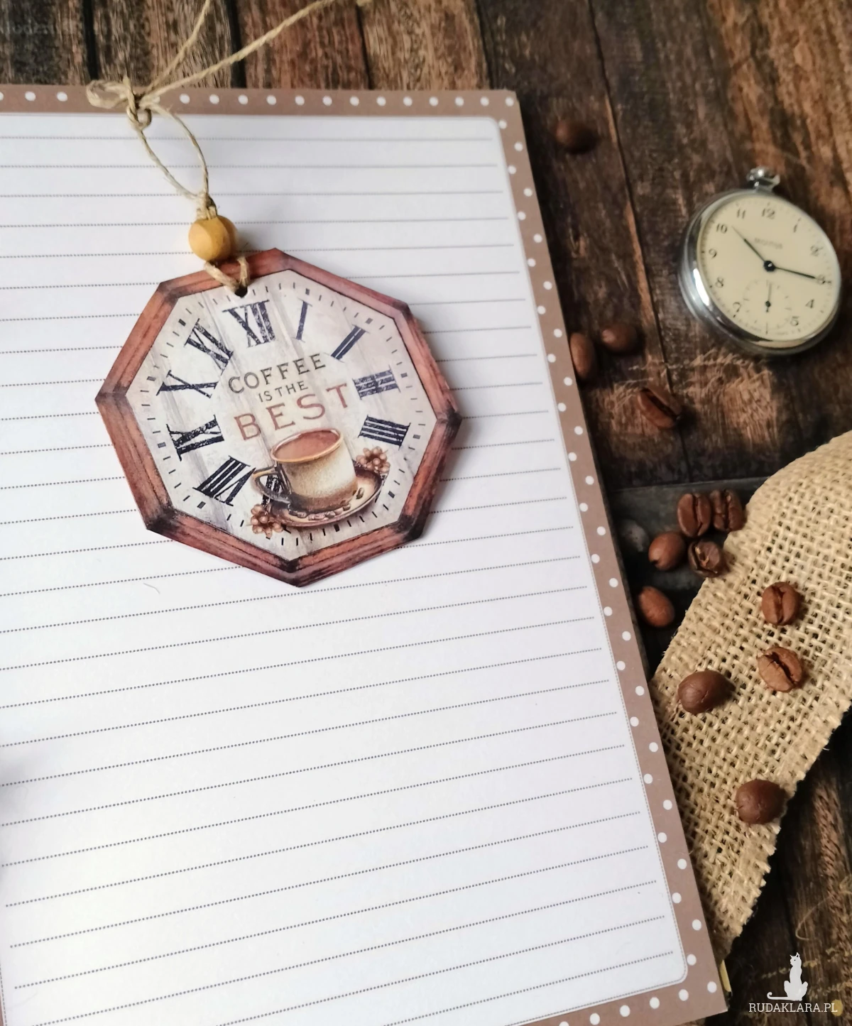 W komplecie zakładka do notesu, tagi, przekładka ,metalowa zawieszka coffee.