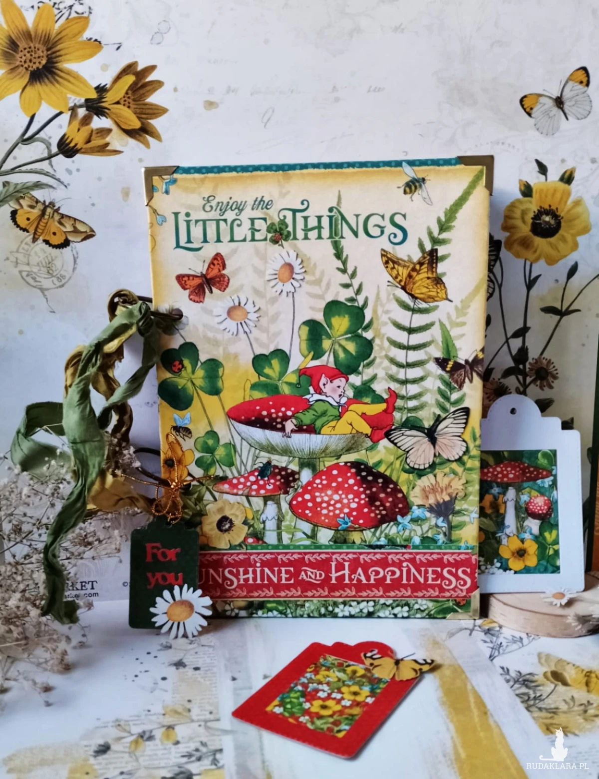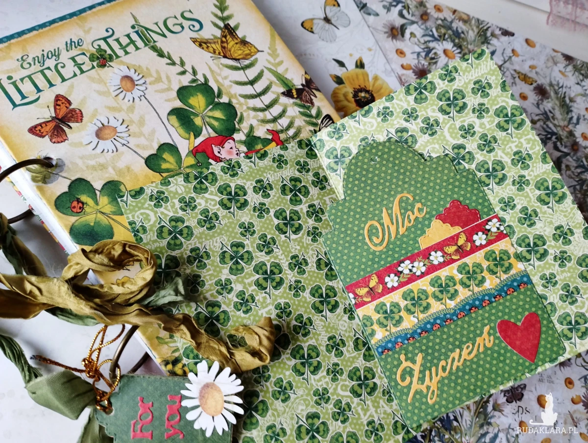 Format A5/100 kartek W środku notesu kieszonki z kolorowymi tagami , zakładka oddzielająca strony, karta z grafiką koniczynek oraz elfów.
