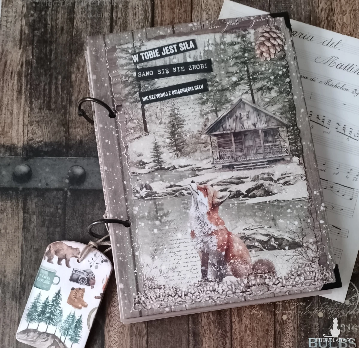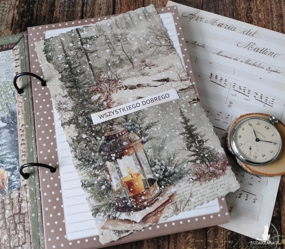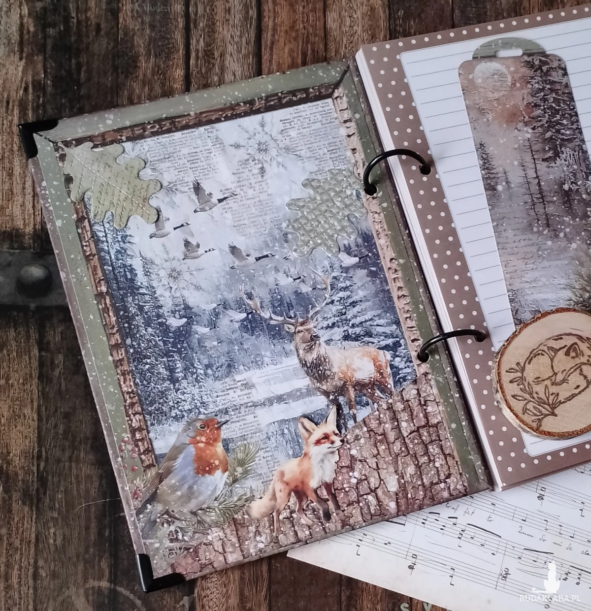 Format A5/100 kartek w linie, nadruk jednostronny. Okładki twarde z tektury introligatorskiej. W środku kieszonki na tagi, dwie ozdobne karty z grafiką. Notes wykonany ręcznie techniką scrapbooking.