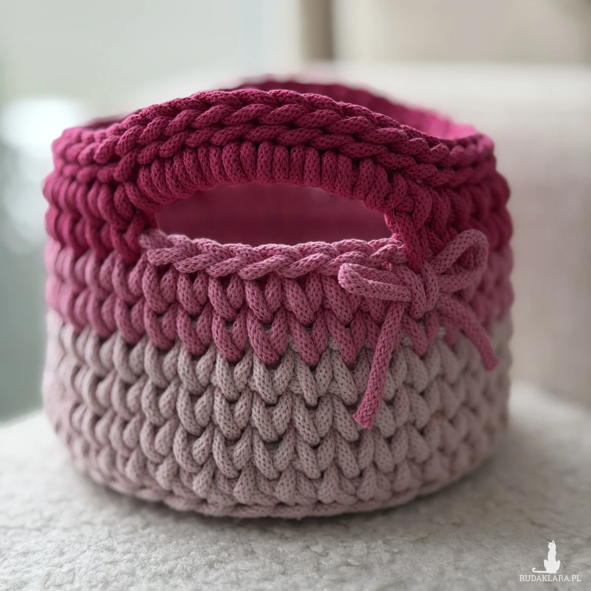 Jedyny w swoim rodzaju, ręcznie pleciony koszyk ze sznurka bawełnianego w różowych odcieniach – od najdelikatniejszego jasnego po głęboki róż. Średnica 23 cm, wysokość 15 cm. Wyposażony w wygodne uszy.