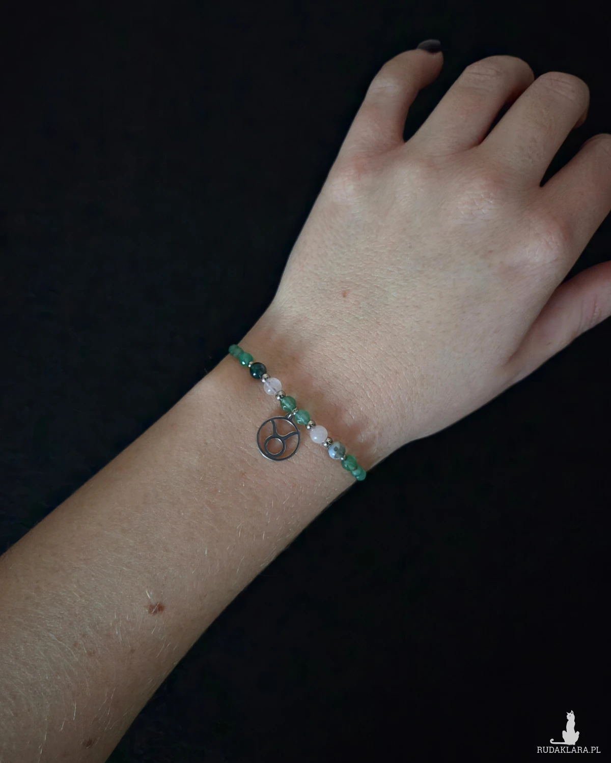 Bransoletka Zodiakalna „Byk” to harmonijna, ciepła kompozycja stworzona z myślą o osobach urodzonych pod znakiem Byka — stabilnych, lojalnych, ceniących bezpieczeństwo, bliskość natury i komfort życia. Zielone odcienie kamieni przełamane delikatnym różem oraz srebrnymi akcentami tworzą elegancką, spokojną całość, która odzwierciedla ziemski charakter Byka. Srebrna zawieszka z symbolem znaku podkreśla indywidualność bransoletki, czyniąc ją osobistym talizmanem równowagi i obfitości.