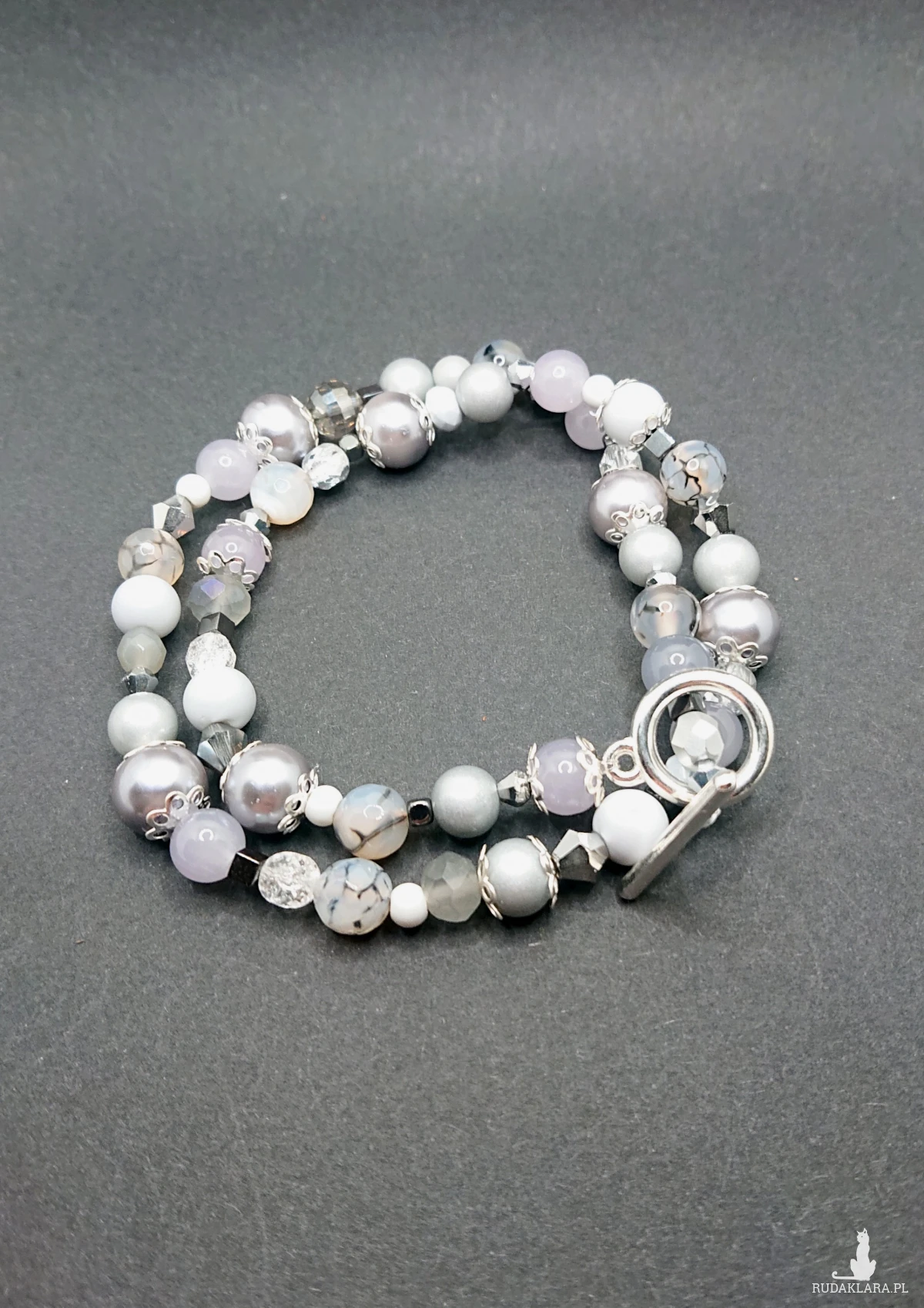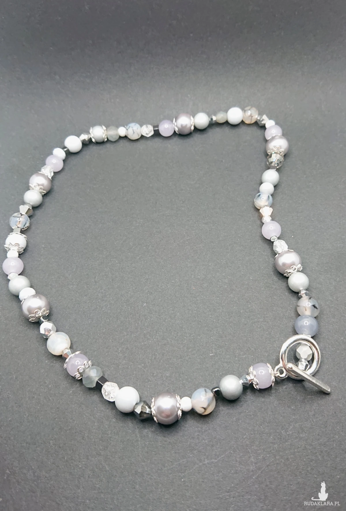Naszyjnik wykonany z szklanych koralików, kamieni ozdobnych oraz metalowych elementów. Kolorystyka w odcieniach koloru szarego z srebrnymi dodatkami.