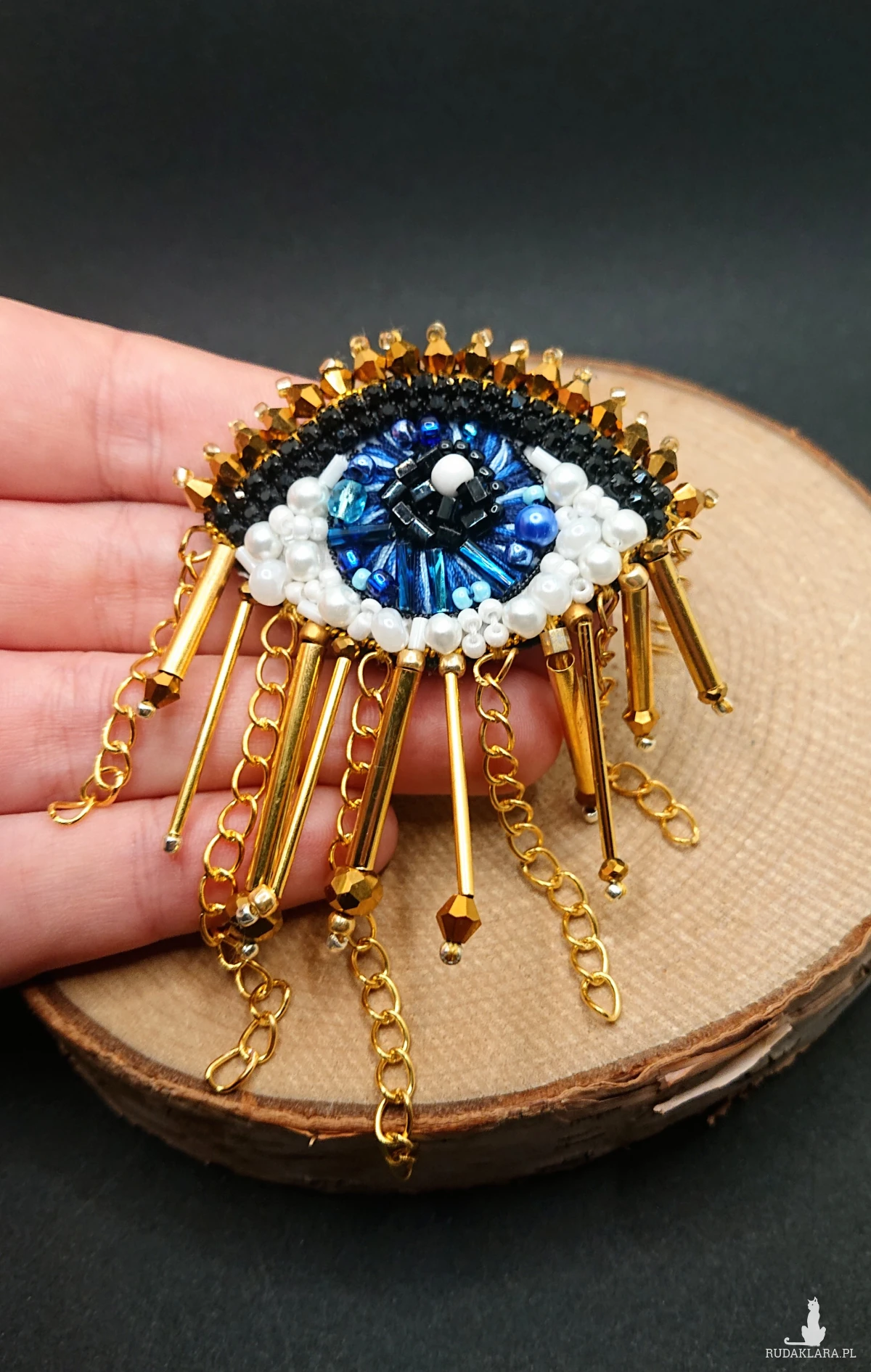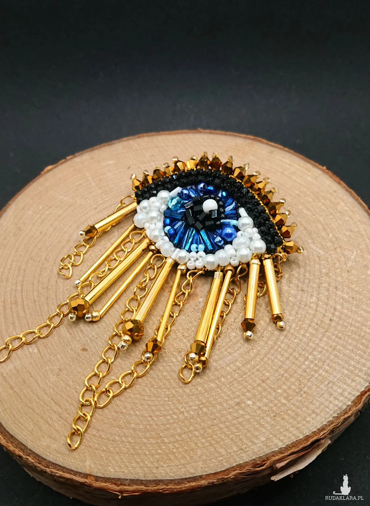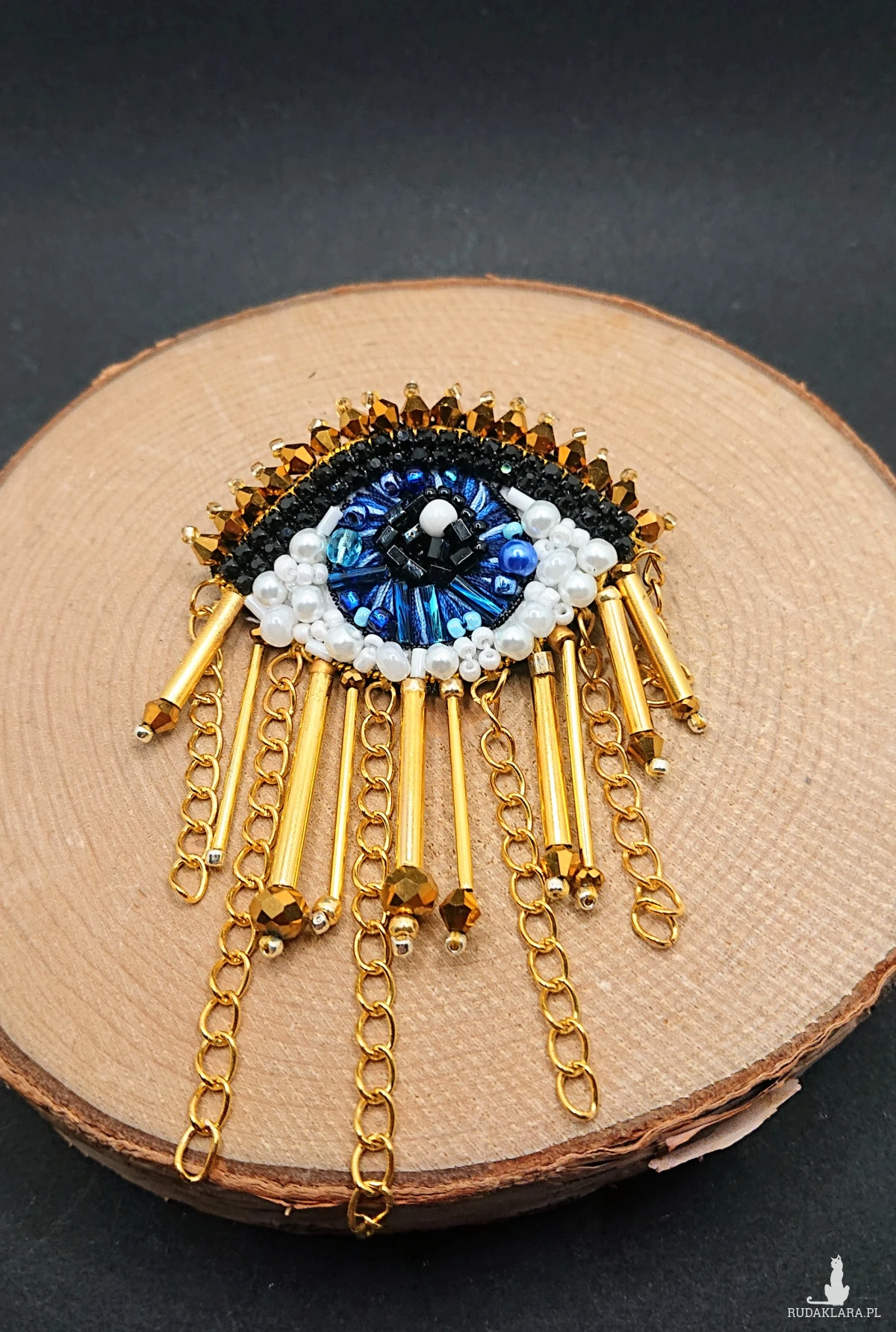 Broszka w kształcie niebieskiego oka z złotymi elementami. Wykonana z szklanych koralików o różnych kształtach i wielkościach, taśmy z cyrkoniami oraz niewielkich szklanych koralików. Dół broszki ozdobiony metalowymi łańcuszkami i rurkami o różnych rozmiarach.