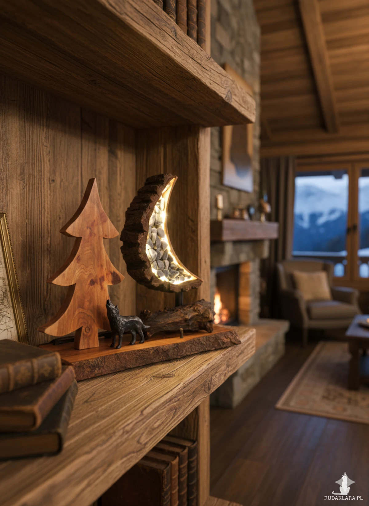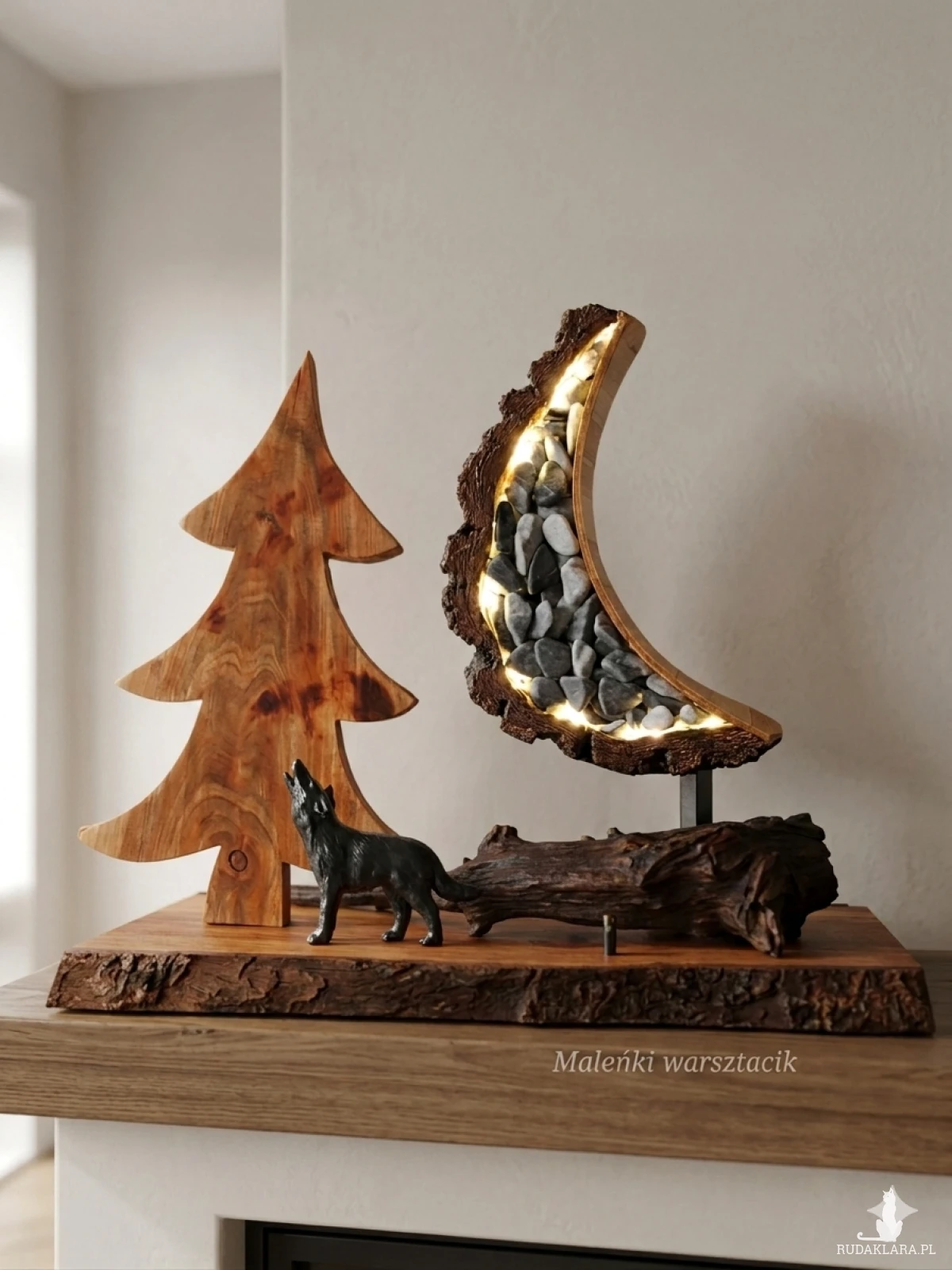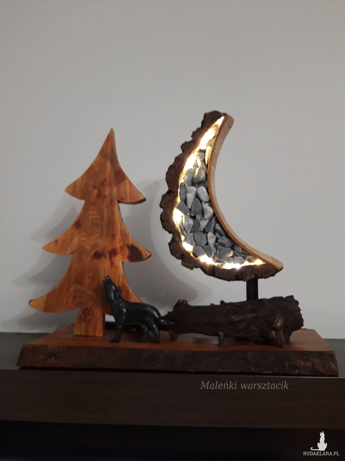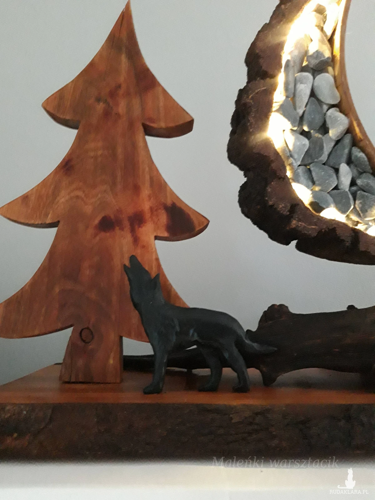 Materiał: drewno drzewa owocowego -czereśnia, kora brzozy, kamienie w niebieskim odcieniu, księżyc podświetlany lampkami led.