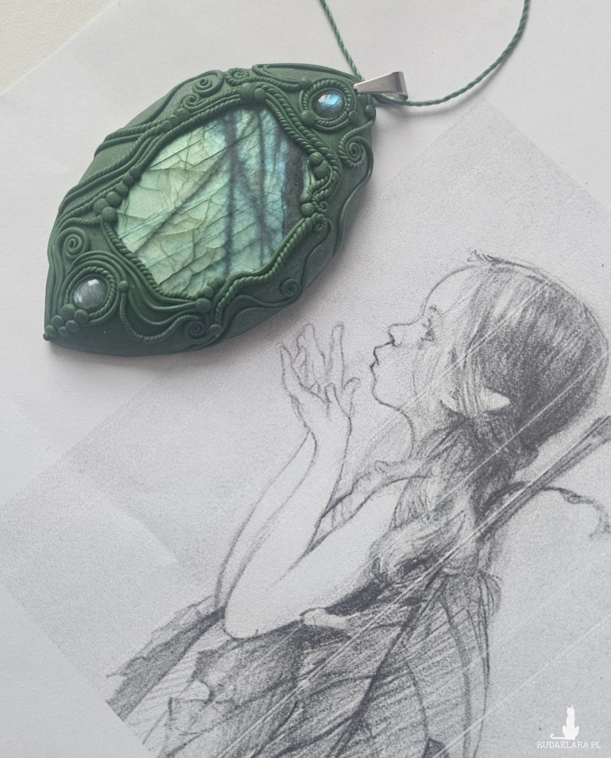 Wisior/naszyjnik/amulet/talizman wykonany misternie z gliny polimerowej. Ozdobiony filigranami, wzorami nawiązującymi do roślinnych pnączy, elfów czy do wzorów orientalnych.