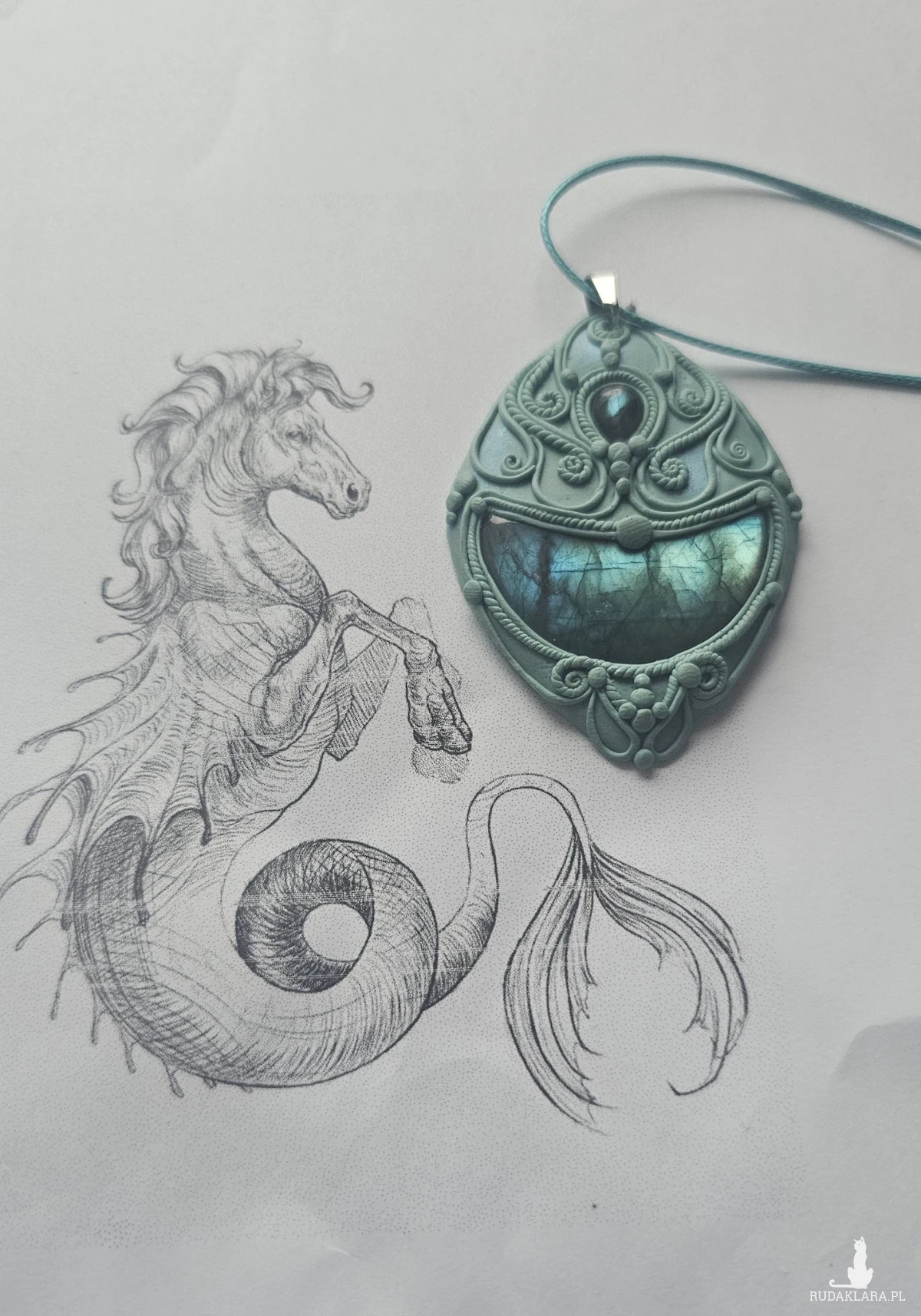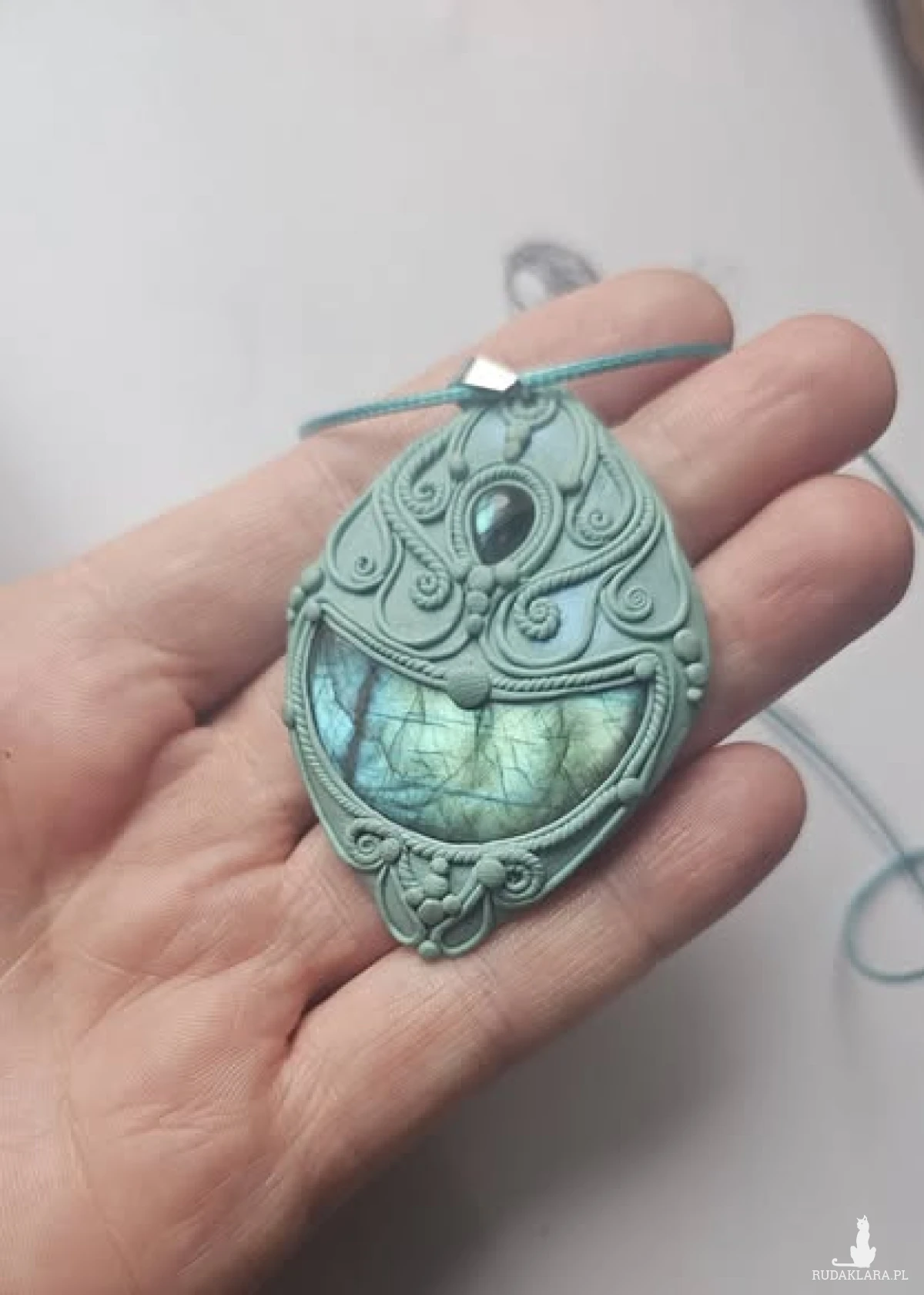 Wisior/naszyjnik/amulet/talizman wykonany misternie z gliny polimerowej. Ozdobiony filigranami, wzorami nawiązującymi do pnączy, elfów czy do wzorów orientalnych.