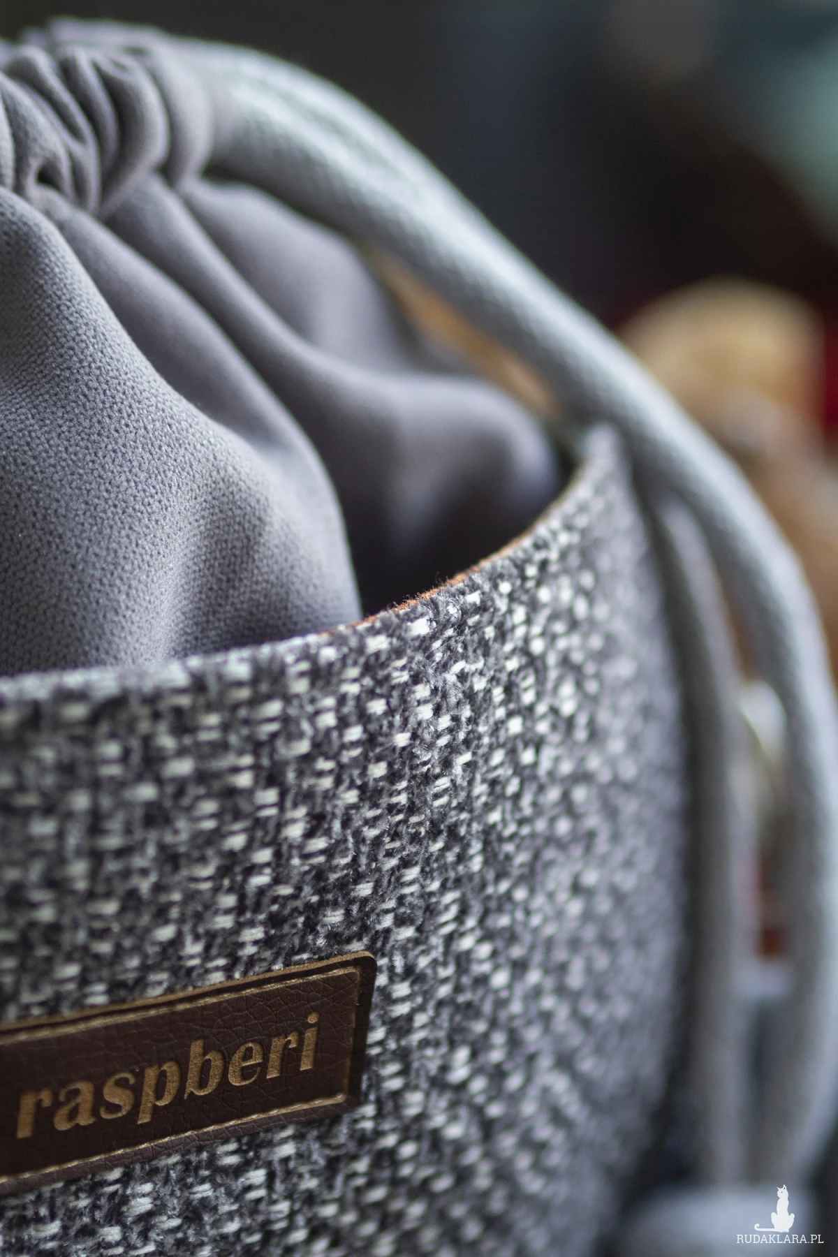 Całość ściągana grubym, bawełnianym sznurkiem w kolorze jasnoszarym.