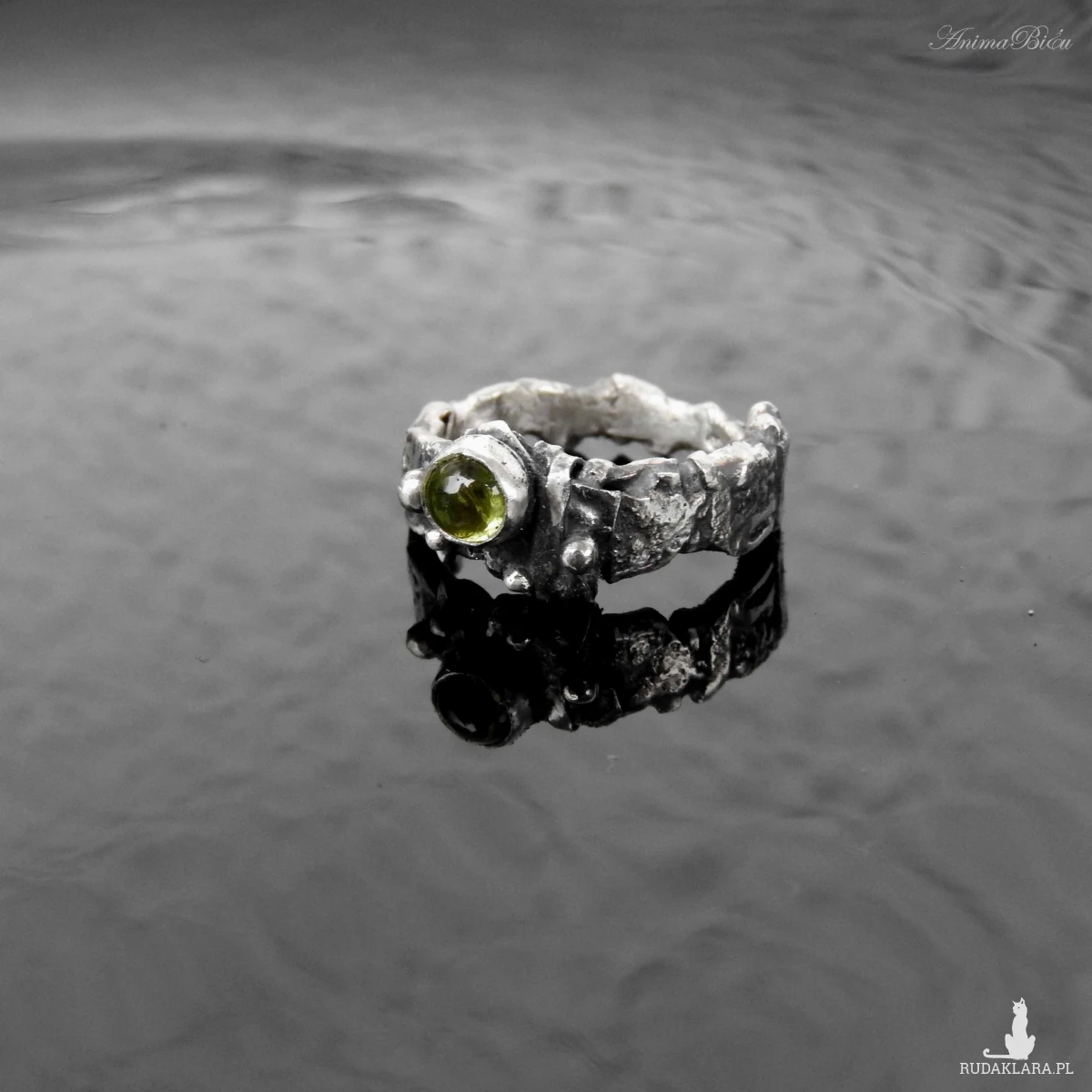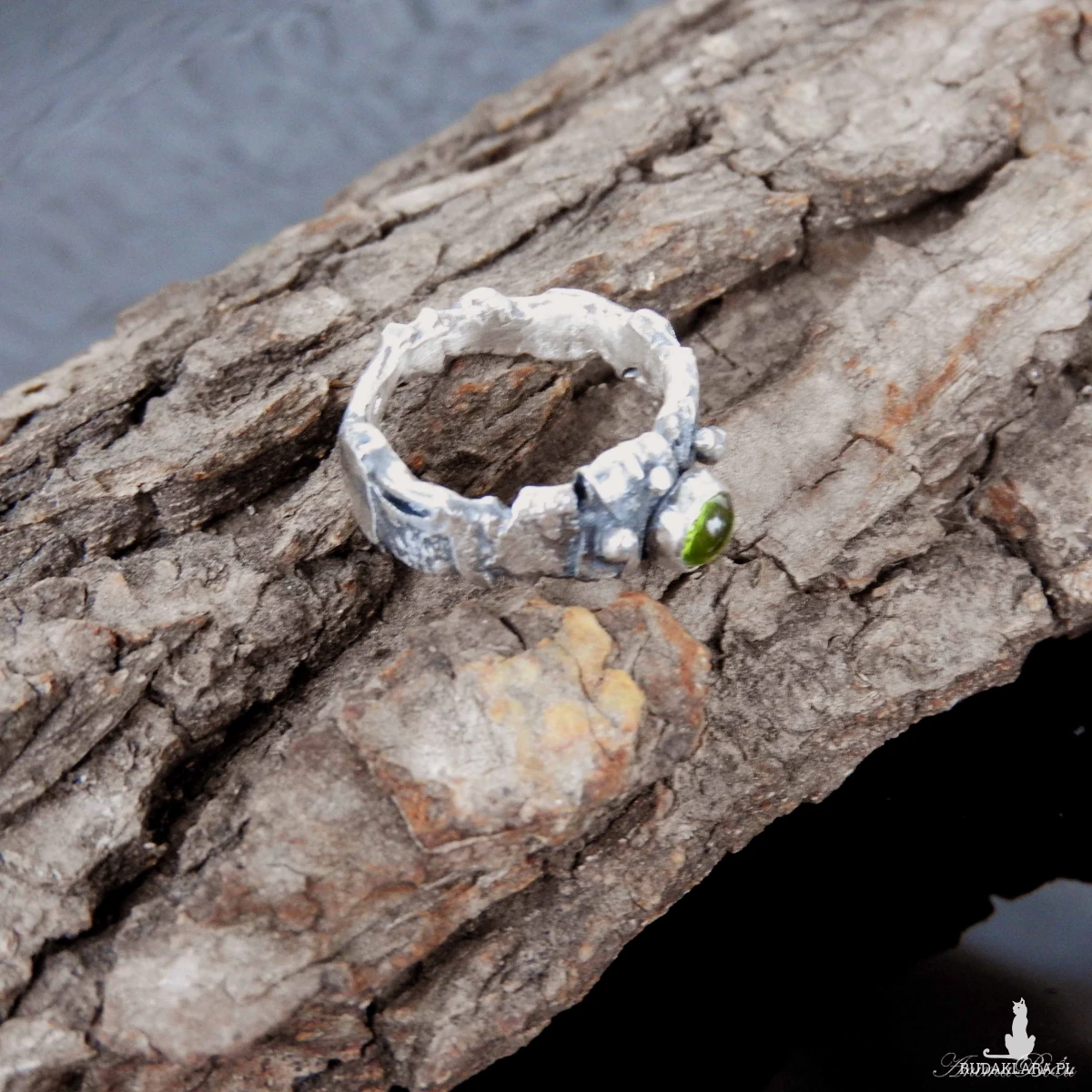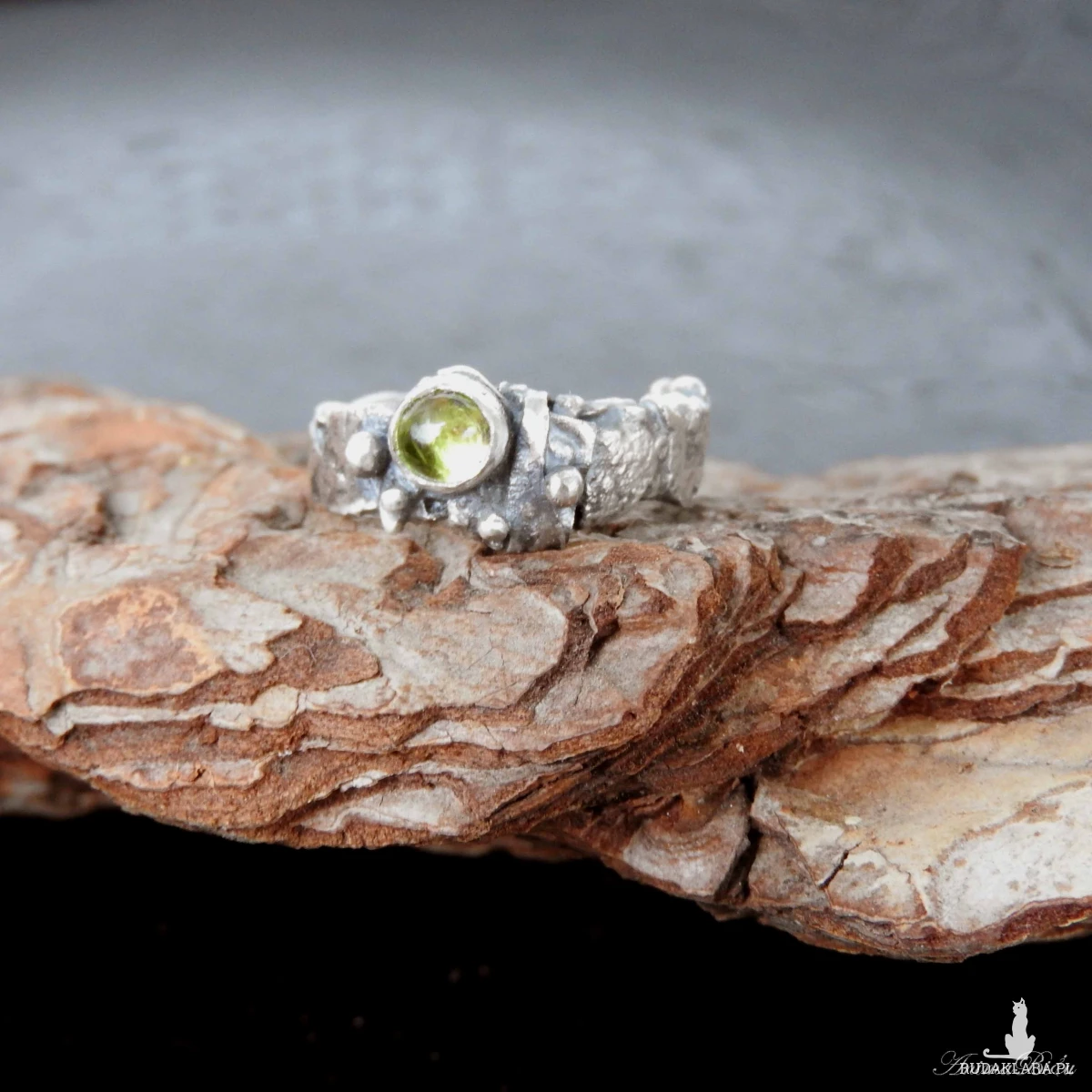 Obrączka srebrna z oliwinem. Wykonana od podstaw ręcznie powstała z przetapianego srebra próby 925, które mocno przyciemniłam i miejscami wypolerowałam. Charakter pierścionka jest bardzo surowy, srebro ma nieregularną fakturę, obręcz ma różną szerokość, przy koronie jest nieco szersza. Doskonałym akcentem jest kontrastujący z surowością wyrobu minerał o jasnozielonym odcieniu, czyli uroczy oliwin. Rozmiar jubilerski obrączki wynosi 13 i jest on stały, bez możliwości regulacji. Cechowany w Urzędzie Probierczym. Waga obrączki: 5,7g.