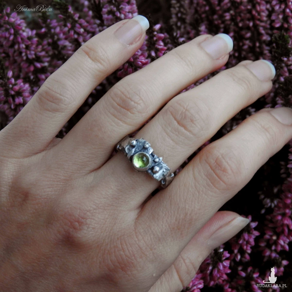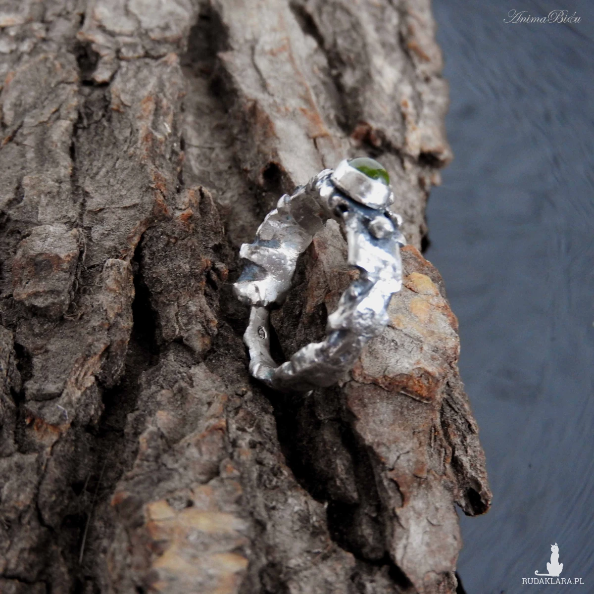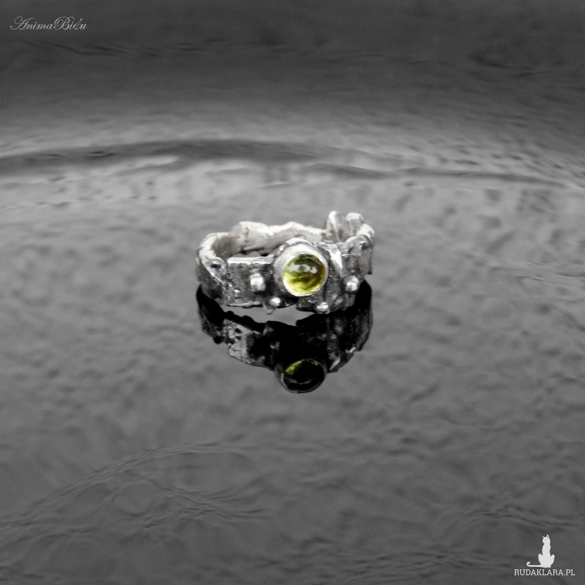 Obrączka srebrna z oliwinem. Wykonana od podstaw ręcznie powstała z przetapianego srebra próby 925, które mocno przyciemniłam i miejscami wypolerowałam. Charakter pierścionka jest bardzo surowy, srebro ma nieregularną fakturę, obręcz ma różną szerokość, przy koronie jest nieco szersza. Doskonałym akcentem jest kontrastujący z surowością wyrobu minerał o jasnozielonym odcieniu, czyli uroczy oliwin. Rozmiar jubilerski obrączki wynosi 13 i jest on stały, bez możliwości regulacji. Cechowany w Urzędzie Probierczym. Waga obrączki: 5,7g.